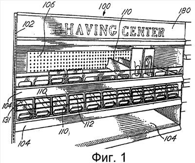 Разделители 110 товаров могут быть смонтированы на витринной системе 100 различными способами. Например, разделители 110 могут вставляться в направляющие, сформированные в полке 104, или в направляющие, сформированные в основании, которое крепится к полке 104. Аналогично, разделители 110 могут быть выполнены заодно или как единая деталь с основанием, которое устанавливается на полке. Кроме того, разделители 110 могут быть установлены на направляющую, в канал или в канавку, что понятно специалистам. Разделители 110 должны быть достаточно жесткими для удержания товаров в полосах. Примеры разделителей, которые можно использовать в настоящем изобретении, приведены в патенте США № 6041720, выданном Hardy, в патенте США № 4830201, выданном Breslow, и в международной заявке № РСТ/US02/15760 и в соответствующей международной публикации WO 02/091885 A1 на имя Hardy, которые включены в настоящее описание путем отсылки. Специалистам понятно, что в рамках настоящего изобретения можно использовать и другие известные разделители и способы их крепления к полкам.