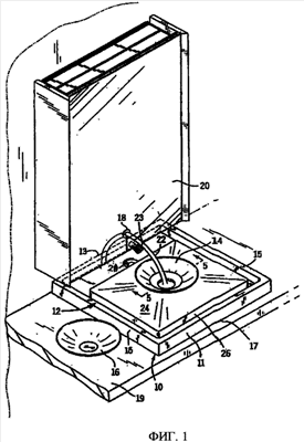 Верхний участок поддона 12 имеет центральную рабочую поверхность 24 с краями, которые опускаются вниз, в желоб 26. Рабочая поверхность 24 является, по существу, плоской и горизонтальной. Однако предпочтительно, чтобы рабочая поверхность была слегка выпуклой, с выступающей наверх верхушкой в центре и наклоненной вниз, от центра к желобу 26, так что вода из струи 24 быстро течет к краям рабочей поверхности, по всем направлениям – в желоб. Более того, предпочтительно, чтобы желоб 26 полностью окружал рабочую поверхность 24, как показано. В предпочтительном варианте осуществления поток 22 воды из выпускной трубы 18 для воды течет по изогнутой траектории на вершину выпуклого поддона 12 для мытья, так что вода равномерно стекает в желоб 26 со всех сторон.