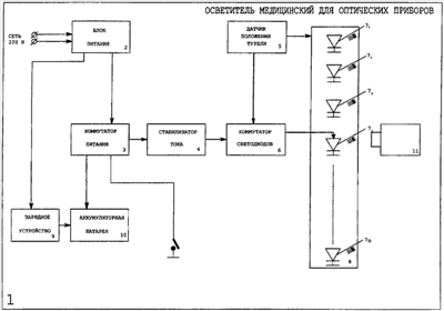 Решаемая техническая задача в осветителе медицинском для оптических приборов, содержащем корпус с размещенными внутри него источником света, последовательно соединенными блоком питания, коммутатором питания, стабилизатором тока, причем входы блока питания являются выводами для подключения к сети, достигается тем, что дополнительно содержится источник света, выполненный в виде монохромных светодиодов различной длины волны, которые вмонтированы в установленную с возможностью перемещения, относительно световода, турель, причем разъемы светодиодов соответственно, по очередности, соединяются с выходом коммутатора светодиодов, датчик положения турели, выход которого соединен с выводом коммутатора светодиодов, выход стабилизатора тока подключен к входу коммутатора светодиодов, вывод блока питания подключен к входу зарядного устройства, выход которого соединен с выводом аккумуляторной батареи, выход коммутатора питания соединен с входом аккумуляторной батареи, вывод коммутатора питания соединен с выключателем света, выходы светодиодов являются выводами для подключения к наконечнику световодного кабеля.