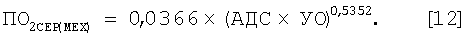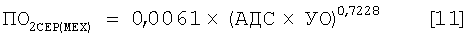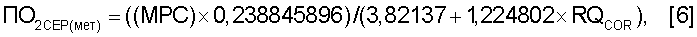 Изобретение относится к медицине, а именно к клинической физиологии, кардиологии и кардиохирургии. Известен способ точной оценки потребления кислорода сердцем (ПО2СЕРД) с помощью измерения коронарного кровотока методом Кейти и Шмидта и параллельного измерения содержания кислорода в отбираемых пробах крови из артерии и коронарного синуса сердца [Jorgensen, Kazuto Kitamura, Frederick et al. – Long-term precision of the N22O, установка зонда в артерию и коронарный синус сердца, через которые во время дыхания газовой смесью производят синхронный отбор серии проб крови для газового анализа на содержание в них N2O и кислорода, а каждое исследование занимает большой промежуток времени. По причине своей громоздкости метод N2O Кейти и Шмидта используется только в исследовательской практике физиологических лабораторий и не получил распространения в кардиохирургических и кардиологических клиниках для многократного измерения ПО2СЕРД у пациента в процессе лечения и оценки результатов хирургического вмешательства при сердечно-сосудистых заболеваниях. Чтобы исключить применение сложных методов измерения ПО2СЕРД при сердечных сокращениях, часто прибегают к косвенному оцениванию этой величины путем умножения систолического артериального давления на ударный или минутный объем кровообращения (АДС×УО). Получаемая в этом случае величина имеет размерность, которая не позволяет преобразовывать ее в иные точно интерпретируемые физиологические величины, такие как ПО2СЕРД, мощность сердечного сокращения, коэффициент полезного действия сердца. С целью исключить указанные выше технологические трудности и сделать возможным мониторинг этого важнейшего параметра сердца предлагается следующий способ оценки ПО2СЕРД у пациента в режиме мониторинга в клинических условиях. Для этого необходимо использовать элементарную единицу метаболической работы сердца (МРС) в Дж/(кг за 1 цикл), либо Дж/((АДС×УО) за 1 цикл), а также величину механической работы сердца в Дж/((АДС×УО) за 1 цикл). Эти метаболические единицы работающего сердца получают по таблицам справочника [Кровообращение и газообмен человека: Справочное руководство / Ю.А.Власов, Г.Н.Окунева. – 2-е изд., перераб. и доп. – Новосибирск: Наука. Сиб. отдел-ние, 1992. – 310 с. Таблицы 39 (стр.99) и 42 (стр.104)]. Способ реализуется следующим образом. 1. У пациента либо измеряют массу сердца (МСЕР) с помощью эхокардиографии, компьютерной или ядерно-магнитнорезонансной томографии, либо оценивают ее по массе тела, используя уравнения [Власов, Волков, 2004]. Эти измерения или оценки массы сердца осуществляют однократно перед мониторингом. 2. Измеряют частоту сердечных сокращений (ЧСС). Для этих целей могут быть использованы данные Холтеровского мониторирования ритма сердца. 3. Измеряют или оценивают дыхательный коэффициент миокарда RQCOR. 4. Измеряют несколько раз либо мониторируют артериальное давление у пациента (АДС). 5. Измеряют ударный объем сердца (УО) либо прямо по Фику, либо эхокардиографическим способом, либо по сфигмокардиографии. 6. По возрасту пациента В (возраст должен выражаться десятичной дробью) находят стандартную величину метаболической работы сердца (МРСД), выражаемой количеством джоулей, расходуемых 1 кг массы сердца за один цикл для мужчин от года до 12 лет –