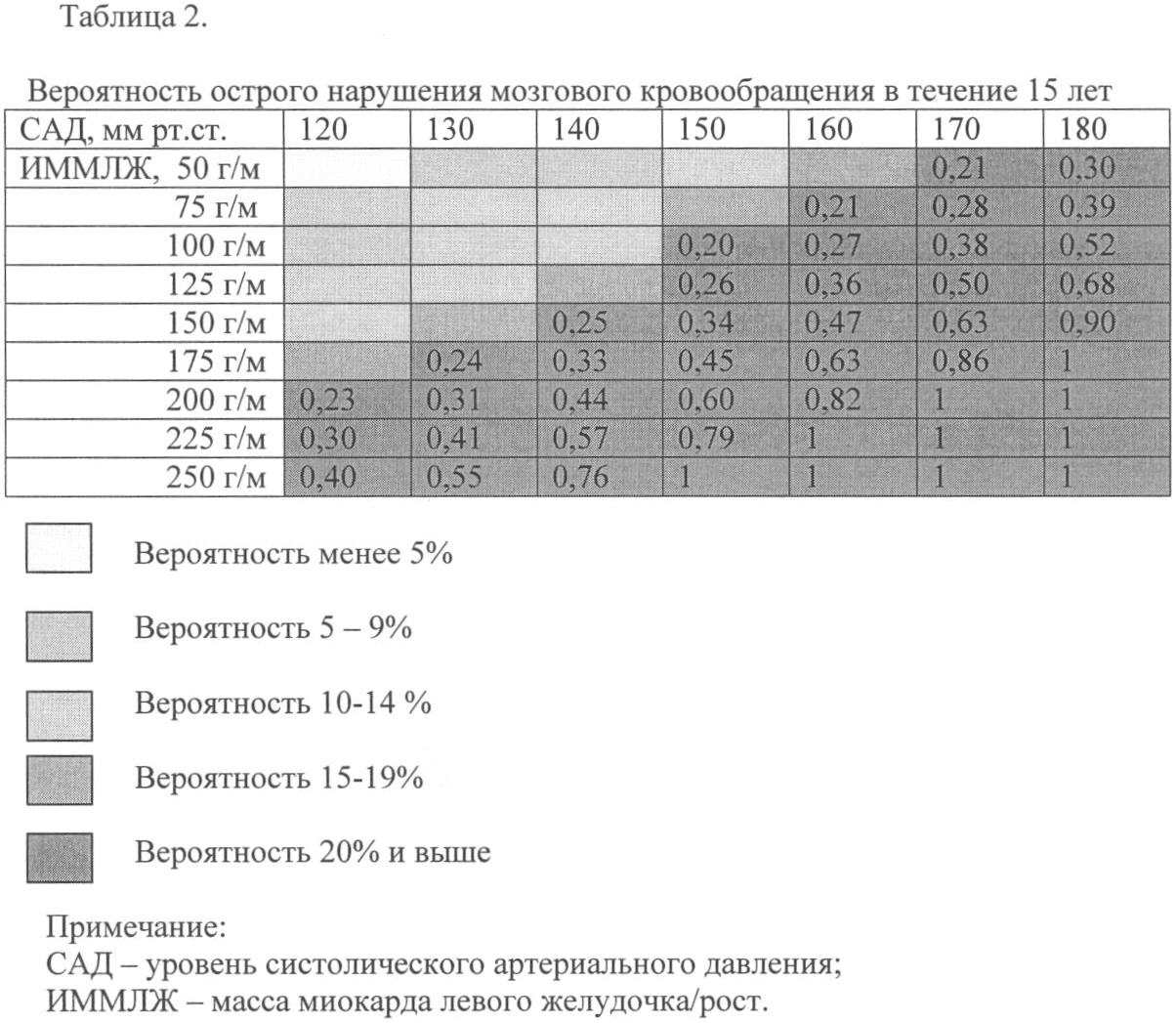 Изобретение относится к медицине, в частности к кардиологии, и может быть использовано для прогнозирования исходов артериальной гипертензии у лиц в возрасте 40-59 лет через 15 лет после установления диагноза. Прогноз пациента артериальной гипертензией обусловлен взаимодействием трех факторов: уровень артериального давления, наличие факторов риска и поражение органов-мишеней. Существует два способа определения прогноза пациента – по факту существования этих признаков (ВОЗ-МОАГ, 1999 год) и по уровню выраженности факторов риска (SCORE, Eur Heart J; 15: 1300-1331). Наиболее близка к изобретению шкала SCORE, дающая десятилетний индивидуальный прогноз фатальных сердечно-сосудистых исходов. Данные шкалы не учитывают основных функциональных характеристик органов-мишеней и степень вероятности отдельных осложнений. В то же время известно, что гипертрофия левого желудочка существенно влияет на прогноз развития сердечно-сосудистых осложнений. При изучении прогноза больных артериальной гипертензией выявлена зависимость фатальных и нефатальных осложнений артериальной гипертензии от некоторых факторов риска, уровня артериального давления и показателей гипертрофии левого желудочка. Задачей настоящего изобретения является прогнозирование осложнений артериальной гипертензии по имеющимся сведениям об основных факторах риска, уровню артериального давления, показателям эхокардиографии. Техническим результатом изобретения является прогнозирование отдаленных (15-летних) исходов (смертность от сердечно-сосудистых осложнений, острое нарушение мозгового кровообращения) у больного артериальной гипертензией. Указанный технический результат реализуется за счет того, что в способе прогнозирования отдаленных исходов артериальной гипертензии у пациентов в возрасте 40-59 лет, согласно изобретению выявляют факторы риска: наследственность, уровень общего холестерина, уровень систолического артериального давления, показатели гипертрофии левого желудочка; наблюдают в течение 15 лет, затем анализируют соответствия исходов артериальной гипертензии с первичными показателями; составляются таблицы риска; по таблице 1 (А – без наследственности, В – с наследственностью) на пересечении общего холестерина и толщины задней стенки прогнозируют вероятность фатальных сердечно-сосудистых осложнений; по таблице 2 на пересечении систолического давления и индекса массы миокарда левого желудочка прогнозируют вероятность острого нарушения мозгового кровообращения. Проведенные исследования по патентным и другим научно-техническим источникам информации показали, что предлагаемый способ не известен, не следует явным образом из научного уровня техники, т.е. соответствует критериям «новизна» и «изобретательский уровень». Способ осуществляется следующим образом. У пациента выявляют следующие показатели: наследственность, уровень общего холестерина, толщина задней стенки, уровень артериального давления, индекс массы миокарда левого желудочка. При определении вероятности фатальных сердечно-сосудистых осложнений выделяют пациентов с наследственностью (Насл.) и без наследственности отдельно. На пересечении показателей ТЗС (толщина задней стенки) и ОХ (уровень общего холестерина) получают вероятность данного осложнения. Показатель вероятности развития о