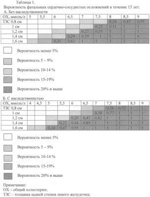 Способ прогнозирования отдаленных исходов артериальной гипертензии у пациентов в возрасте 40-59 лет, отличающийся тем, что у пациента выявляют следующие показатели: наследственность по артериальной гипертензии, уровень общего холестерина, толщина задней стенки, уровень артериального давления, индекс массы миокарда левого желудочка; наблюдают в течение 15 лет, затем анализируют соответствия исходов артериальной гипертензии с первичными показателями; составляют таблицы риска, по таблицам: 1А – без наследственности по артериальной гипертензии, 1В – с наследственностью по артериальной гипертензии, на пересечении показателей общего холестерина и толщины задней стенки прогнозируют вероятность фатальных сердечно-сосудистых осложнений; по таблице 2 на пересечении показателей систолического давления и индекса массы миокарда левого желудочка прогнозируют вероятность острого нарушения мозгового кровообращения.