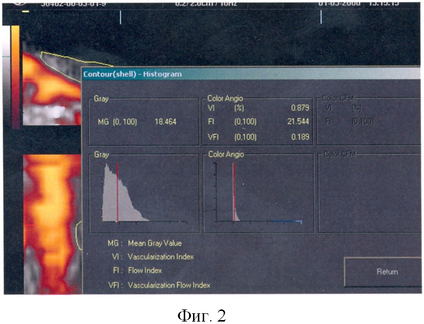 Индекс акустической плотности определяется на основании поглощенных и отраженных ультразвуковых эхосигналов после создания специально обработанной модели патологического очага и свидетельствует о степени разреженности или плотности образования, при этом эхосигналы суммируются практически от всех точек патологического образования. MG рассчитывается по условным единицам плотности исходя из средних значений интенсивности ультразвукового сигнала. Следовательно, чем более «серым», насыщенным представляется изображение, тем выше его плотность и наоборот. Индекс васкуляризации имеет огромное значение при характеристике патологического очага, поскольку отражает количество сосудов во всем объеме патологического очага. Это значение выражается в процентах (%), где общий объем образования принимается за 100%. Следовательно, чем выше индекс васкуляризации, тем больше в образовании сосудистой ткани. Индекс потока характеризует качественный компонент гемодинамики и отражает соотношение ткани с активной циркуляцией крови к всему объему образования. Индекс потока выражается в условных единицах, и, чем выше показатель индекса потока, тем выше скорость кровотока в исследуемой ткани.