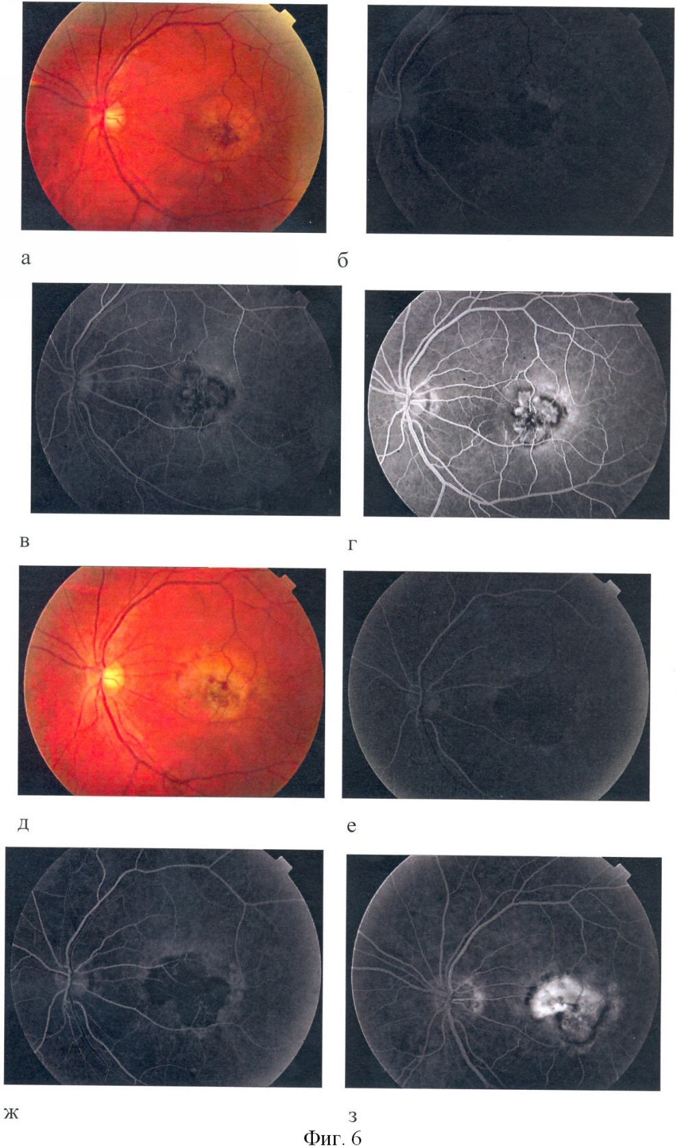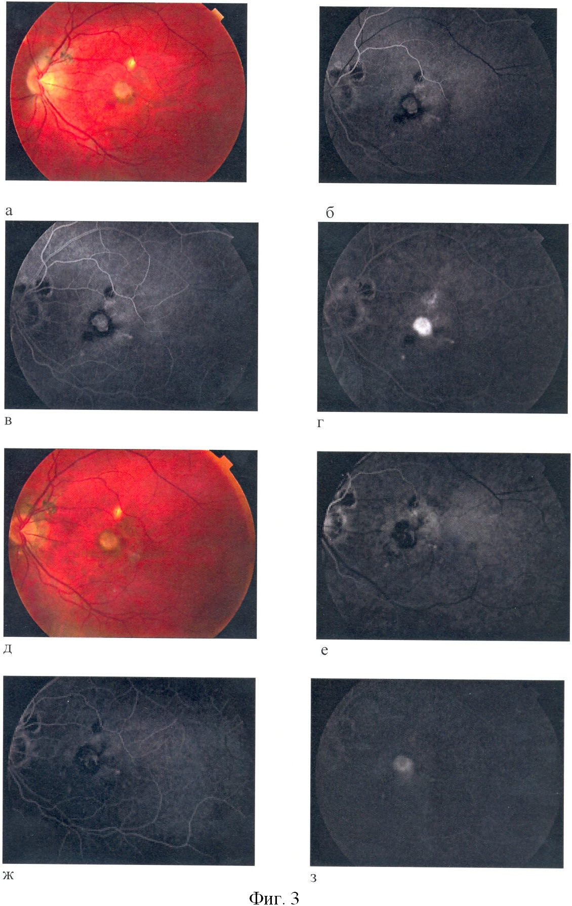 Через 12 месяцев сравнивали остроту зрения, офтальмоскопическую и ангиографическую картину пациента А. Острота зрения в начале наблюдения составила 0,1 на фигуре 3 (а, б, в, г,) видна активная СНМ с выраженным отеком и кровоизлиянием. Через 12 месяцев острота зрения составила 0,5, а при проведении ангиографии видно образование плоского субретинального рубца – фигура 3 (д, е, ж, з). Таким образом, в результате образования плоского субретинального рубца острота зрения повысилась, что свидетельствует о благоприятном течении заболевания.