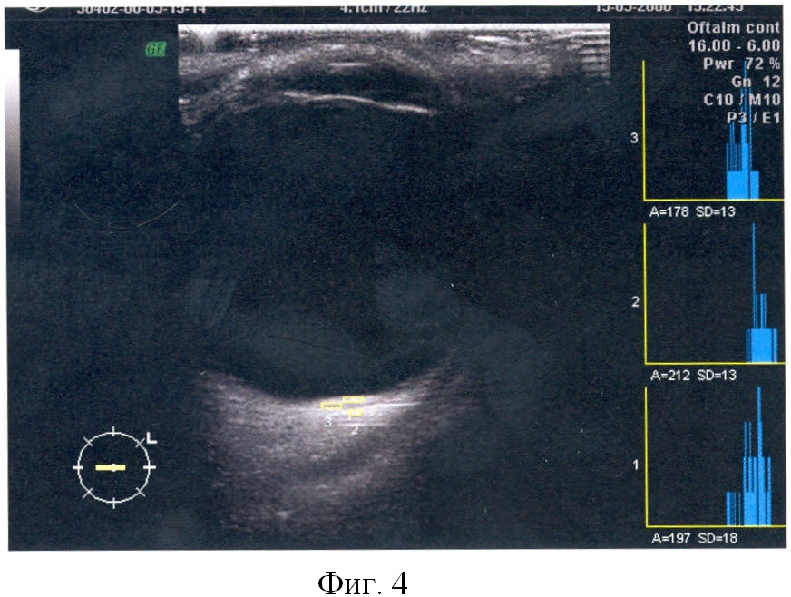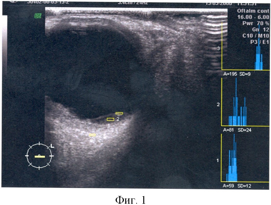 В двухмерном режиме серой шкалы определялась плотность очага поражения на основании данных послойного сканирования в стандартном режиме. Измерение плотности производили следующим образом: плотность измеряли в двух различных локусах патологического очага и сравнивали с ультразвуковой плотностью склеры. После этого рассчитывали ультразвуковой коэффициент плотности (K2D), для чего среднюю плотность патологического очага соотносили с ультразвуковой плотностью склеры по формуле
