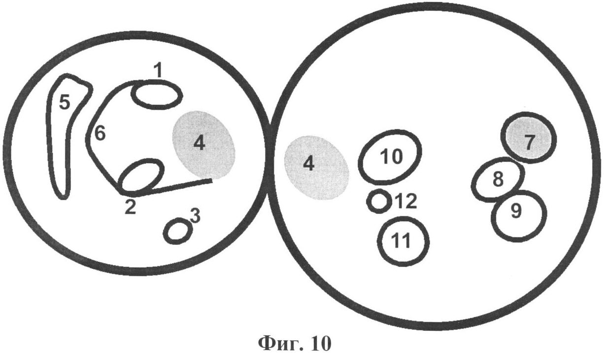 Устье правой верхней легочной вены (фиг.10, 10) – 39 мм – 293°; 22 мм – 270°; 31 мм – 233°; 40 мм – 270° на кольце митрального клапана (справа).