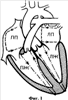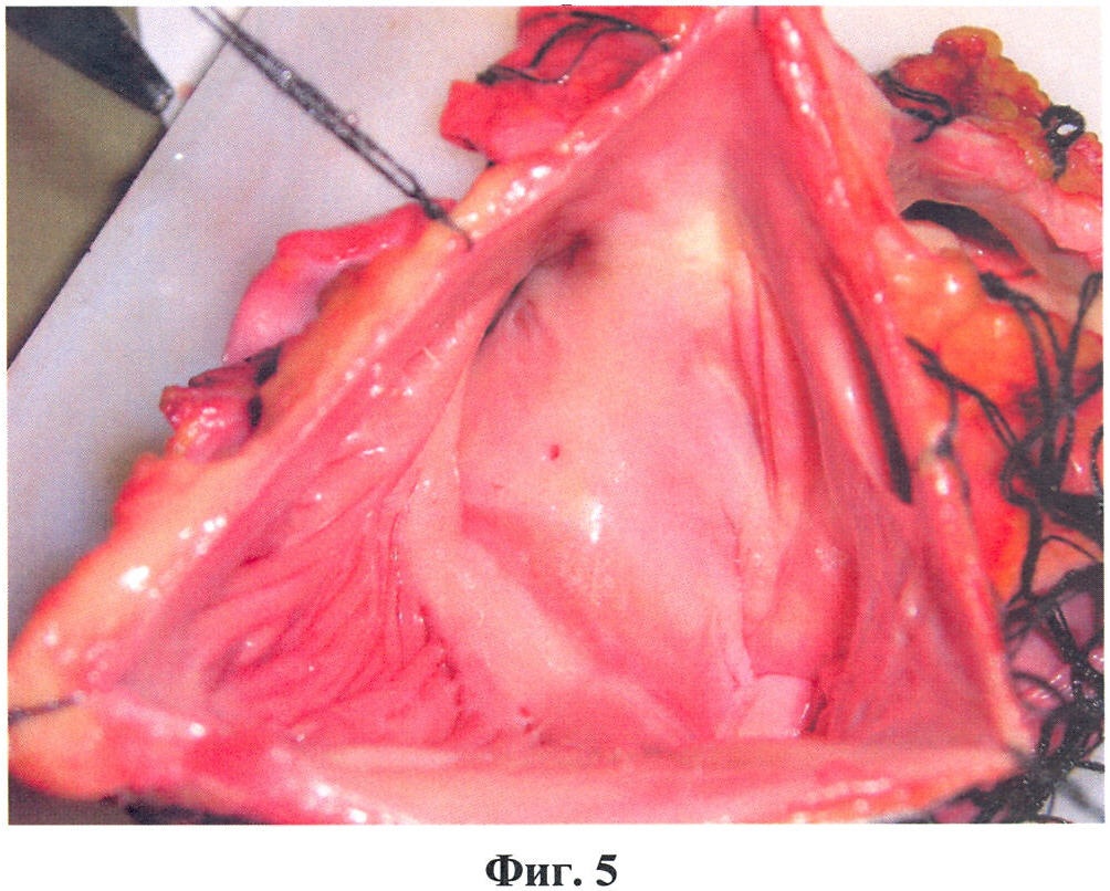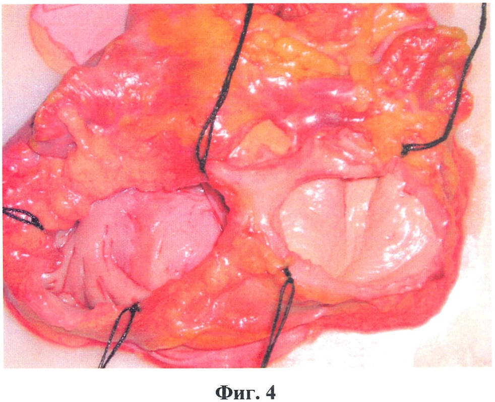 При этом производится рассечение свободной стенки правого предсердия от устья верхней полой вены до устья нижней полой вены параллельно и слева от пограничной борозды. Затем разрез продолжается до основания ушка правого предсердия параллельно и прямо над правой коронарной артерией. Вскрытие левого предсердия осуществляется разрезом его свода кнаружи от устьев левых до устьев правых легочных вен параллельно межпредсердной перегородке и затем над коронарным синусом до ушка левого предсердия с последующим отсечением всей задней стенки левого предсердия (фиг.1). После чего подвергается визуальному анализу эндокардиальная поверхность обоих предсердий с измерением циркулем расстояний между анатомическими структурами.