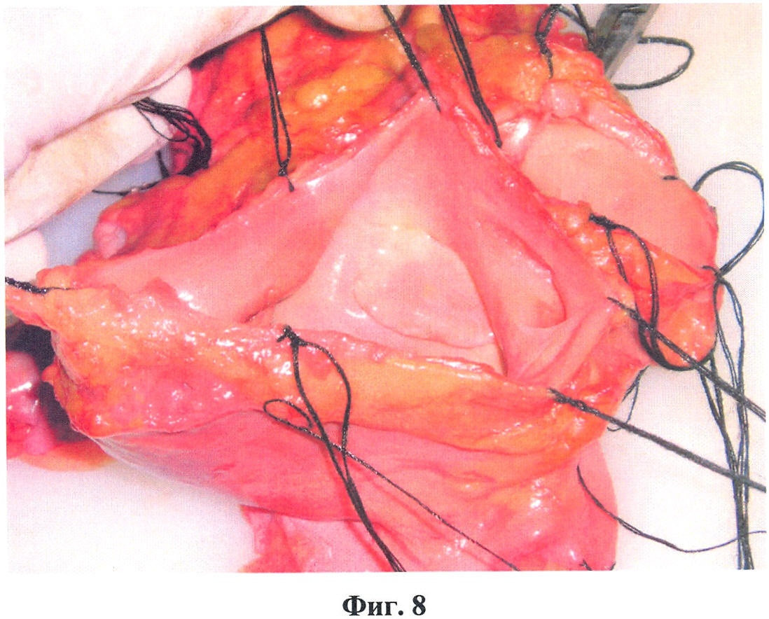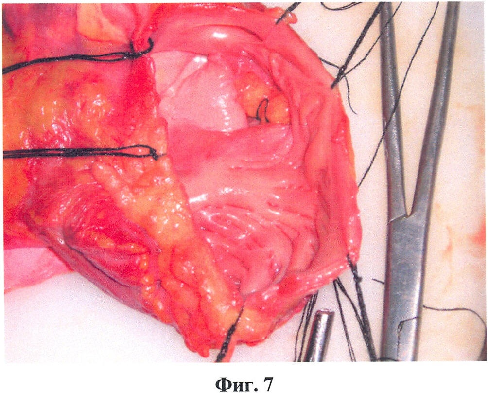 путем натягивания лигатурных нитей осуществляют расширение фиброзных колец и визуальный осмотр эндокардиальной поверхности предсердий;