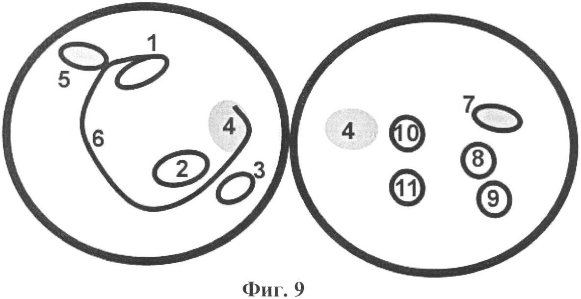 Пример 2. Топография внутрипредсердных структур при посмертном изучении эндокардиальной предсердной поверхности у мужчины 52 лет. Эндокардиальная поверхность относительно нормальной анатомии правого и левого предсердий показана на фиг.7 и фиг.8 соответственно. Топография предсердной эндокардиальной поверхности согласно предложенному нами способу представлена на фиг.9 (масштаб 154%).