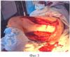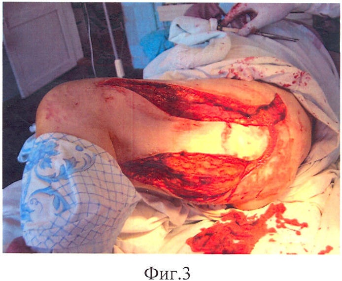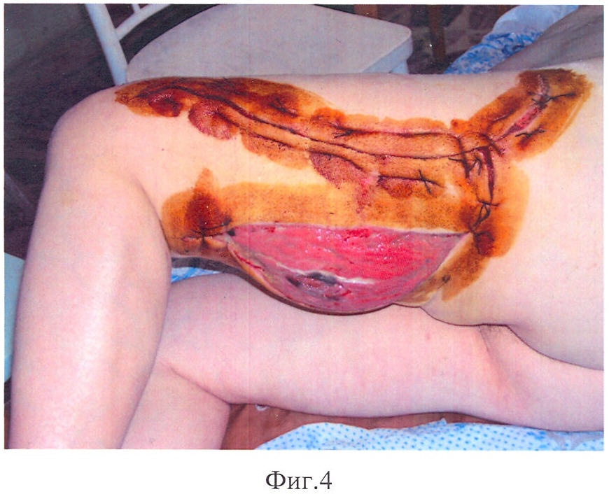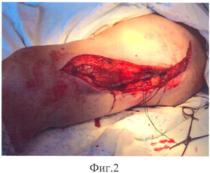 Пример. Больной А., 56 лет. ИБ № 538, поступил в республиканский ожоговый центр МУ ГКБ № 18 г.Уфы в 2004 г. с диагнозом: Ожог IIIAB-IV степени лица, левой верхней конечности 5% (4%). Синдром длительного сдавления левой нижней конечности. Алкогольное опьянение. После стабилизации состояния выполнена открытая фасциотомия по предлагаемому способу. Было сделано два продольных и поперечный волнообразные разрезы, с рассечением кожи, подкожно-жировой клетчатки, фасции на левом бедре с пересечением регионарных лимфатических сосудов. Гемостаз коагуляцией и наложением Z-образных швов. Диастаз фасциотомных разрезов составил от 2 до 12 см. Продолжительность операции – 40 минут (Фиг.1-2). В раннем послеоперационном периоде (1-3 сутки) отмечалось обильное серозное отделяемое с раневых поверхностей и уменьшение отечности левого бедра (Фиг.3). В последующем были проведены этапные некрэктомии некротизированной мышечной ткани, сшивание ран и аутодермопластики расщепленным сетчатым лоскутом (Фиг.4). После полной эпителизации и проведения раннего курса реабилитации больной выписан на 42 день лечения. При контрольном осмотре в 2005 году рубцы на левом бедре мягкие, не спаяны с нижележащими тканями, движение в суставах в полном объеме. Признаки лимфостаза, венозной недостаточности и мышечной грыжи отсутствуют.