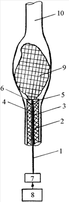 Работа устройства состоит в следующем. Через цистоскоп в мочеточник 9 вводят гибкий зонд 1, представляющий пластмассовый цилиндр 2 с каналом 3, выполненный, например, из фторопласта. Через канал 3 проходит акустический волновод 4, соединенный с пьезопреобразователем 7, соединенным с генератором 8 электрических колебаний. Акустический волновод 4 оканчивается вибратором, выполненным в виде конического концентратора 5, который расположен в углублении 6, выполненном на дистальной части пластмассового цилиндра 2. При движении в мочеточнике 10 благодаря такому расположению конического концентратора 5 в углублении 6 исключается возможность травматизма стенок мочеточника 10. Движение гибкого зонда 1 производится до тех пор, пока он не упрется в почечный камень 9. При этом контакт с почечным камнем 9 будет с коническим концентратором 5, который расположен в центре углубления 6. При установлении контакта производится установка режима на генераторе 8 электрических колебаний, параметры которого (частота, длительность, интенсивность) определяются заранее на этапе диагностики. Генератор 8 электрических колебаний воздействует электрическими колебаниями на пьезопреобразователь 7, который преобразует их в ультразвуковые колебания, передающиеся по акустическому волноводу 4 к коническому концентратору 5. Под действием колебаний ультразвуковой частоты происходит разрушение почечного камня 9. Поскольку гибкий зонд 1 выполнен меньшего диаметра, чем мочеточник 10, то в зазоре постоянно находится жидкость, вырабатываемая почкой, которая в данной операции является демпфером при разрушении почечного камня 9. При неполном разрушении почечного камня 9 воздействие может быть повторено. Из-за малой амплитуды, достигающей нескольких микрон, и высокой частоты ультразвуковых колебаний не возникает гидравлического удара. Для исключения возможного контакта конического концентратора 5 со стенками мочеточника 10 он расположен в углублении 6, выполненном в пластмассовом цилиндре 2, при этом высота конического концентратора не более глубины углубления 6.