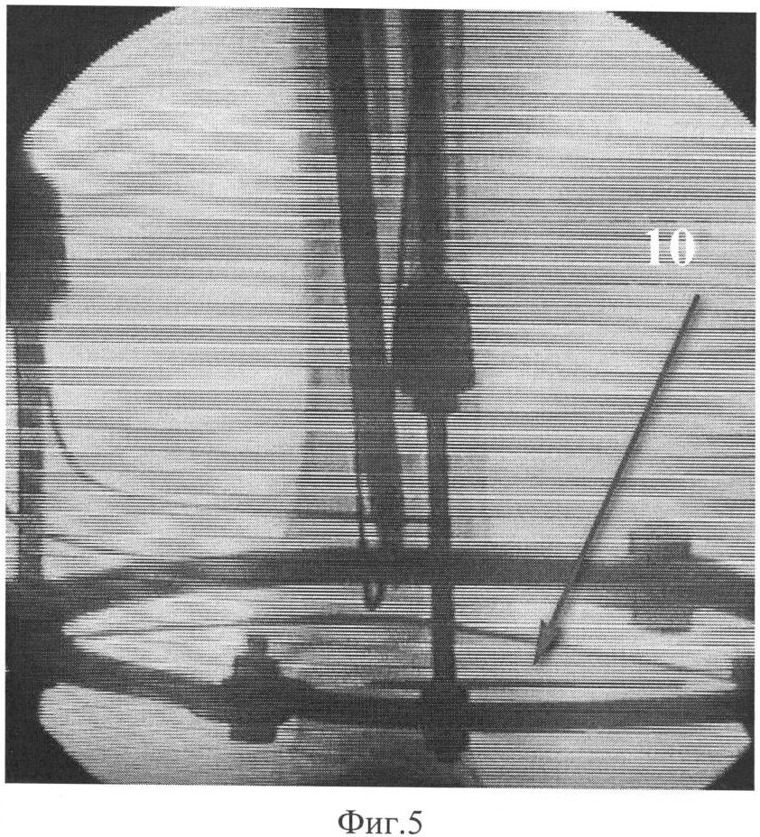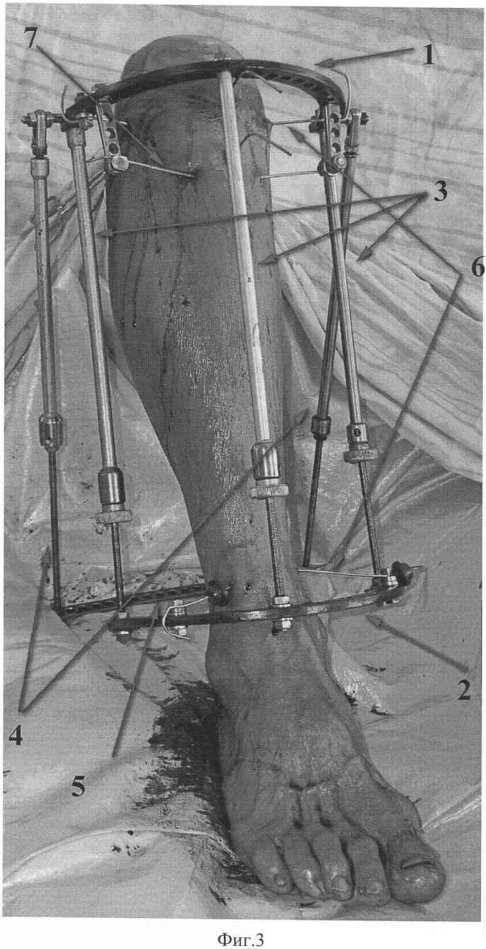Остеосинтез проводят на плоском рентгенопрозрачном столе. Для устранения грубых смещений отломков используют спицевой дистрактор (Фиг.3). Дистрактор состоит из стандартных деталей набора для остеосинтеза по Илизарову: полукольцо 1 – проксимальная опора и кольцо или можно использовать полукольцо 2 – дистальная опора, соединенные тремя телескопическими стержнями 3. К крайним отверстиям полукольца 1 крепятся кронштейны с резьбовыми хвостовиками. К хвостовикам кронштейнов шарнирно крепится подставка, состоящая из телескопических стержней 4 и пластины 5 с отверстиями, соединяющая другие концы стержней 4. Дистрактор накладывают на большеберцовую кость: полукольцо 1 – на уровне проксимального метафиза, кольцо или полукольцо 2 – на уровне дистального метафиза.