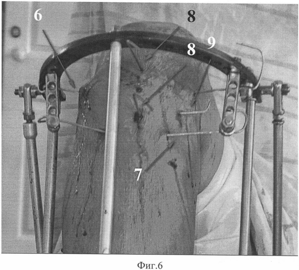 При переломах проксимального отдела большеберцовой кости дополнительно проводят спицу 7 во фронтальной плоскости за гребень большеберцовой кости кпереди от костномозгового канала максимально близко к нижнему концу проксимального отломка, спицу натягивают и закрепляют на консольных приставках на полукольце 1. При последующем сгибании коленного сустава для введения стержня эта спица препятствует появлению смещения под углом, открытым кзади, которое обусловлено тягой сухожилия четырехглавой мышцы бедра.