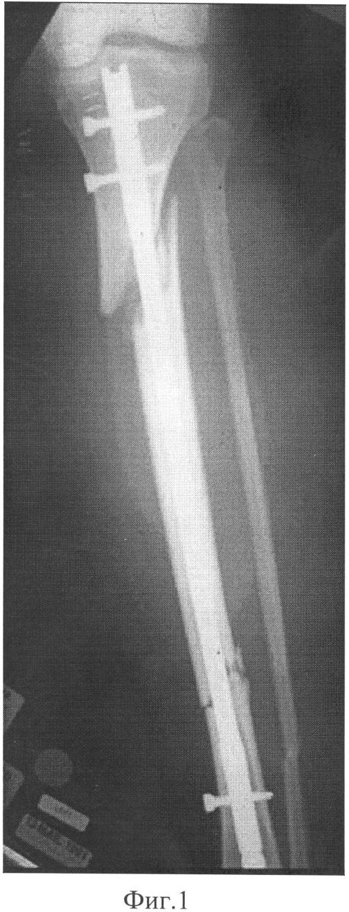 Таким образом, предлагаемый способ расширяет возможности применения интрамедуллярного остеосинтеза при околосуставных и застарелых переломах большеберцовой кости с полным восстановлением анатомической формы кости. Упрощается введение интрамедуллярного гвоздя.