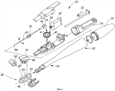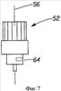 Вал 42 проходит через выступ 60 второго держателя 54 щетины. Выступ 60 имеет прорезь 62, через которую проходит часть вала 42. Выступ 60 помещают в прорезь 64 головки 26, которая направляет держатель 54 при выполнении им поперечных движений. Конец 66 вала 42 кинематически входит в зацепление с прорезью 64 (Фиг.6 и Фиг.7) первого держателя 52 щетины для обеспечения колебательных движений первого держателя 52 щетины вокруг оси 56.