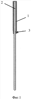 Ручка 1 иглы представляет собой трубку с наружным диаметром порядка 1,3-2 мм и имеет рабочий и заглушенный концы. Внутренний диаметр трубки на несколько десятков микрон больше диаметра стержня 2 иглы. Стержень 2 иглы вставляют в рабочий конец ручки таким образом, чтобы нерабочий (тупой) конец стержня находился на уровне заглушенного конца ручки 1. На рабочем конце ручки поперечно ее оси выполнено резьбовое отверстие, в которое ввернут винт 3. При вворачивании винта 3 его рабочий конец выходит в просвет ручки. Крепление стержня 2 к ручке 1 производится путем введения нерабочего (тупого) конца стержня внутрь ручки 1 до уровня заглушенного его конца и вворачивания винта 3 в ручку до момента устойчивой фиксации стержня внутри ручки 1. На ручке для удобства пользования выполнена накатка. Ручку можно сделать из различных металлов, к примеру из меди, латуни или нержавеющей стали. При использовании медных или латунных материалов желательно их никелирование.