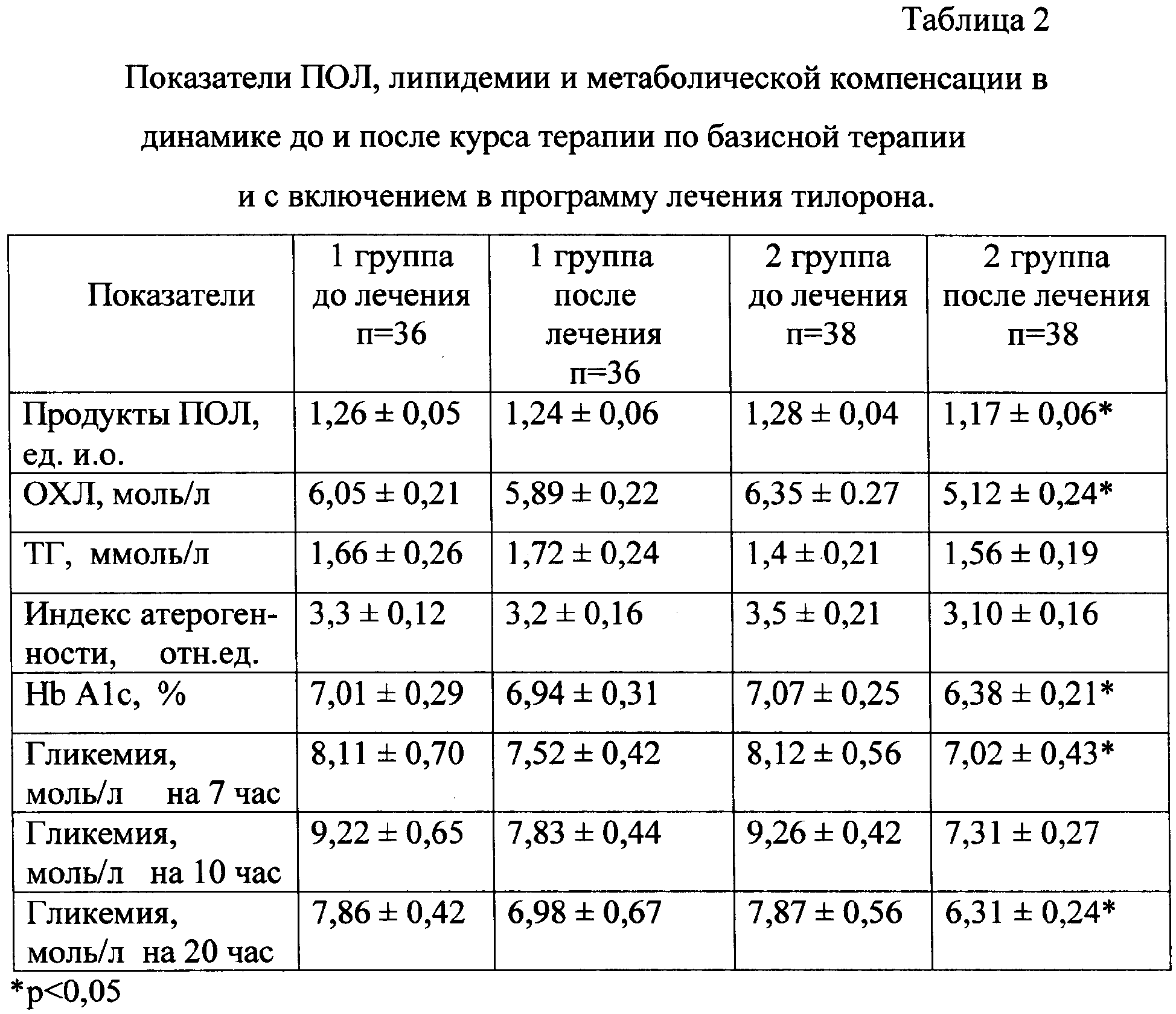 Изобретение относится к медицине, а именно к способам лечения осложненного течения сахарного диабета 2 типа. В ходе обследования больных сахарным диабетом 2 типа в одной из клиник Германии было установлено, что по истечении 9-ти летнего срока давности заболевания, уже у 47% больных выявлялись осложнения. Наиболее частым осложнением сахарного диабета является диабетическая невропатия – это сопутствующее диабету патологическое состояние, вызывающее повышенную заболеваемость и смертность пациентов. У больных диабетом риск ампутаций конечностей в 45 раз выше, чем у пациентов, не страдающих диабетом. Гипергликемия, окислительный стресс, гипоксия-ишемия, нарушение полиольного пути обмена веществ, гликозилирования белков, аксонального транспорта, иммунологические механизмы ведут к серьезным морфологическим дефектам в сосудах и тканях. Усугубляет этот патологический процесс и эндотелиальная дисфункция, которая всегда является ранним признаком сахарного диабета. Как известно, эндотелиальные клетки участвуют в регуляции: сосудистого тонуса, процессов свертывания лимфы и крови, воспаления и иммунного ответа. Дисфункция эндотелиальных клеток ведет к активной продукции провоспалительных цитокинов, к активации тромбоцитов, к митогенезу, воспалению, предрасполагает к адгезии лейкоцитов и вазоконстрикции. Базисная терапия сахарного диабета включает в себя сахароснижающие препараты, назначение сосудистых, метаболических препаратов, антиоксидантов. В комплексной терапии осложненного течения сахарного диабета коррекция иммунологических нарушений, как правило, не проводится. Задачей предлагаемого изобретения является создание способа лечения осложненного течения сахарного диабета 2 типа, в частности, диабетической (дистальной) полиневропатией, позволяющего увеличить эффективность лечения. Предложен способ лечения сахарного диабета 2 типа, осложненного полиневропатией, заключающийся в том, что на фоне базисной терапии диабета, назначают тилорон. При этом его вводят по схеме: 1-й и 2-й дни по 250 мг/сутки и далее через 2 дня на третий по 125 мг независимо от приема пищи, на курс – не менее 2500 мг. Тилорон (международное непатентованное название) – известное лекарственное средство 2,7-бис-[2-(диэтиламино)этокси]-флуорен-9-она дигидрохлорид, выпускаемое в готовой лекарственной форме под торговыми наименованиями «Амиксин» и «Лавомакс» в виде перорального лекарственной препарата – таблеток, покрытых полимерной оболочкой, с содержанием активного вещества 0,06 г (для детей) и 0,125 г (для взрослых) (Инструкция по медицинскому применению препарата «Амиксин», утвержденная 19.12.2003 г.). Тилорон – первый синтетический низкомолекулярный индуктор интерферона, эффективный при пероральном применении в качестве иммуномодулятора, обладает также антивирусной и антимикробной активностью («Тилорон: профиль биологической активности. Фармакологические свойства». Интерактивная Антропология, №1(7) 2006, стр.18-23). Известен препарат тилорон в пероральной лекарственной форме – в виде твердых желатиновых капсул, содержащих активное вещество в количестве 125 мг или 250 мг. Тилорон способен взаимодействовать с различными ферментами, мембранами, биомолекулами, ингибировать протеолиз и синтез простагландинов. Это послужило основанием для включения тилорона в 
