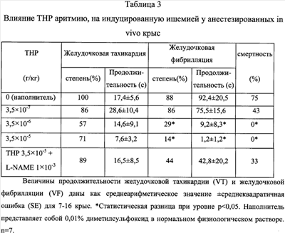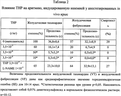 Для того чтобы вызвать ишемию миокарды, провели лигирование путем временного затягивания шелковой лигатуры вокруг главной левой коронарной артерии. Реперфузия достигалась при высвобождении напряжения на лигатуре, используемого для индуцирования аритмии (группы, подвергнутые операции). Мнимо оперированные животные прошли все хирургические манипуляции, за исключением того факта, что шелк, прошедший вокруг левой коронарной артерии, не был завязан (мнимо оперированные группы). За 15 мин до наступления коронарной окклюзии животным через яремную вену провели инфузию болюсом ТНР (3,5×10-7, 3,5×10-6, 3,5×10-5 г/кг), L-NAME (метиловый эфир N -нитро-L-аргинина; 1×10-3 г/кг) или наполнителя (диметилсульфоксид / NaCl 0,9%, 1:103; объем/объем). Окклюзия коронарной артерии продолжалась в течение 30 мин или 5 мин, после этого наступала 30 мин реперфузия. Затем животных случайным образом разделили на следующие группы: (1) мнимо оперированные + наполнитель; (2) мнимо оперированные + ТНР (3,5×10-5 г/кг); (3) оперированные + наполнитель; (4) оперированные + ТНР (3,5×10-7 г/кг); (5) оперированные + ТНР (3,5×10-6 г/кг); (6) оперированные + ТНР (3,5×10-5 г/кг); (7) оперированные + L-NAME (1×10-3 г/кг) + ТНР (3,5×10-5 г/кг). До наступления ишемии или периода реперфузии, а также во время этих процессов проводилась регистрация сердечного ритма (HR), кровяного давления (ВР), а также изменений на электрокардиограмме (ЭКГ). Эктопическую активность желудочка оценивали по диагностическому критерию, поддержанному Лэмбетской конвенцией. У оставшихся в живых животных фиксировали степень и продолжительность желудочковой аритмии, включая желудочковую тахикардию (VT) и желудочковую фибрилляцию (VF). Для того чтобы проанализировать различие по продолжительности VT и VF среди групп животных, получавших лекарственные средства и наполнитель, был использован тест Манна-Уитни. При изучении аритмии изменения кровяного давления и сердечного ритма у крыс, получавших лекарственные средства, и у крыс, получавших наполнитель, анализ проводили сначала с помощью теста ANOVA (анализ вариантов), а затем по тесту Бонферрони. Процентное различие случаев желудочковой тахикардии, желудочковой фибрилляции и коэффициента смертности анализировали методом хи-квадрат. Полученные результаты приведены в таблицах 2-3.