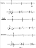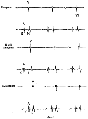 Фиг.1 представляет собой исходную запись, показывающую влияние 10 мкл хинидина на проводимость узла AV. А – предсердная деполяризация; Н – деполяризация узла His; S – артефакт стимуляции; V – желудочковая деполяризация.