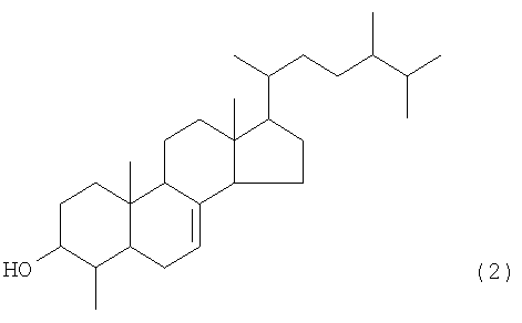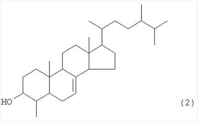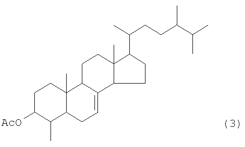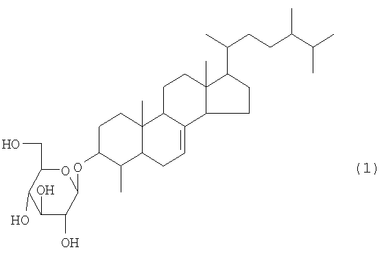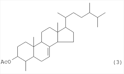 Результаты измерения ЯМР соединения 3 соответствуют значениям для 3-ацетокси-4-метил-эргост-7-ена, указанным в литературе (Yukagaku (Oil Chemistry), Vol.36, No. 5, pp.301-319, 1987). Эти результаты показывают, что соединение 2 представляет собой 4-метил-эргост-7-ен-3-ол. Кроме того, в результате измерения с помощью масс-спектрометрии с бомбардировкой ускоренными атомами (FAB-MS) обнаружено, что молекулярный вес соединения 1 составляет 576. При конденсации соединения 2 (агликоновый остаток) и глюкозы молекулярный вес составляет 414 (соединение 2) + 180 (глюкоза) – 18 (вода) = 576, что соответствует молекулярному весу соединения 1.