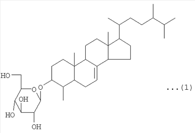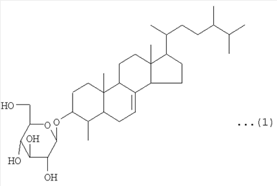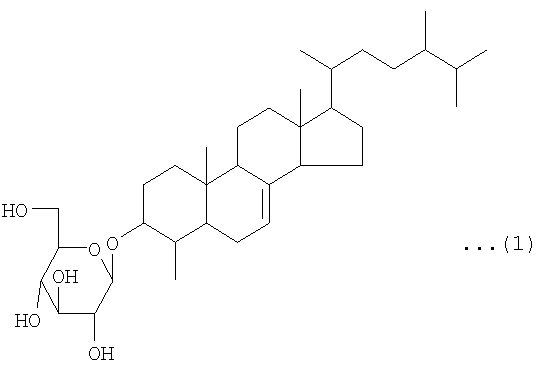 Соединение по данному изобретению может быть также получено путем конденсации D-глюкозы и 4-метил-эргост-7-ен-3-ола. 4-Метил-эргост-7-ен-3-ол может быть получен путем экстракции из растения и очистки. D-глюкоза и 4-метил-эргост-7-ен-3-ол могут быть конденсированы с помощью, например, комбинации способов, описанных в Jikken Kagaku Koza (Лекции по экспериментальной химии), 4th edition, vol. 26, 1992 (описано на с.272, с.297 и с.342). То есть, D-глюкоза полностью ацетилируется, а затем аномерное положение преобразуется в -бромид. Затем 4-метил-эргост-7-ен-3-ол реагирует с -бромидом в диэтиловый эфир, чтобы добиться -гликозилирования, а затем ацетильная группа гидролизуется в смеси метилат натрия/метанол с получением заданного соединения.