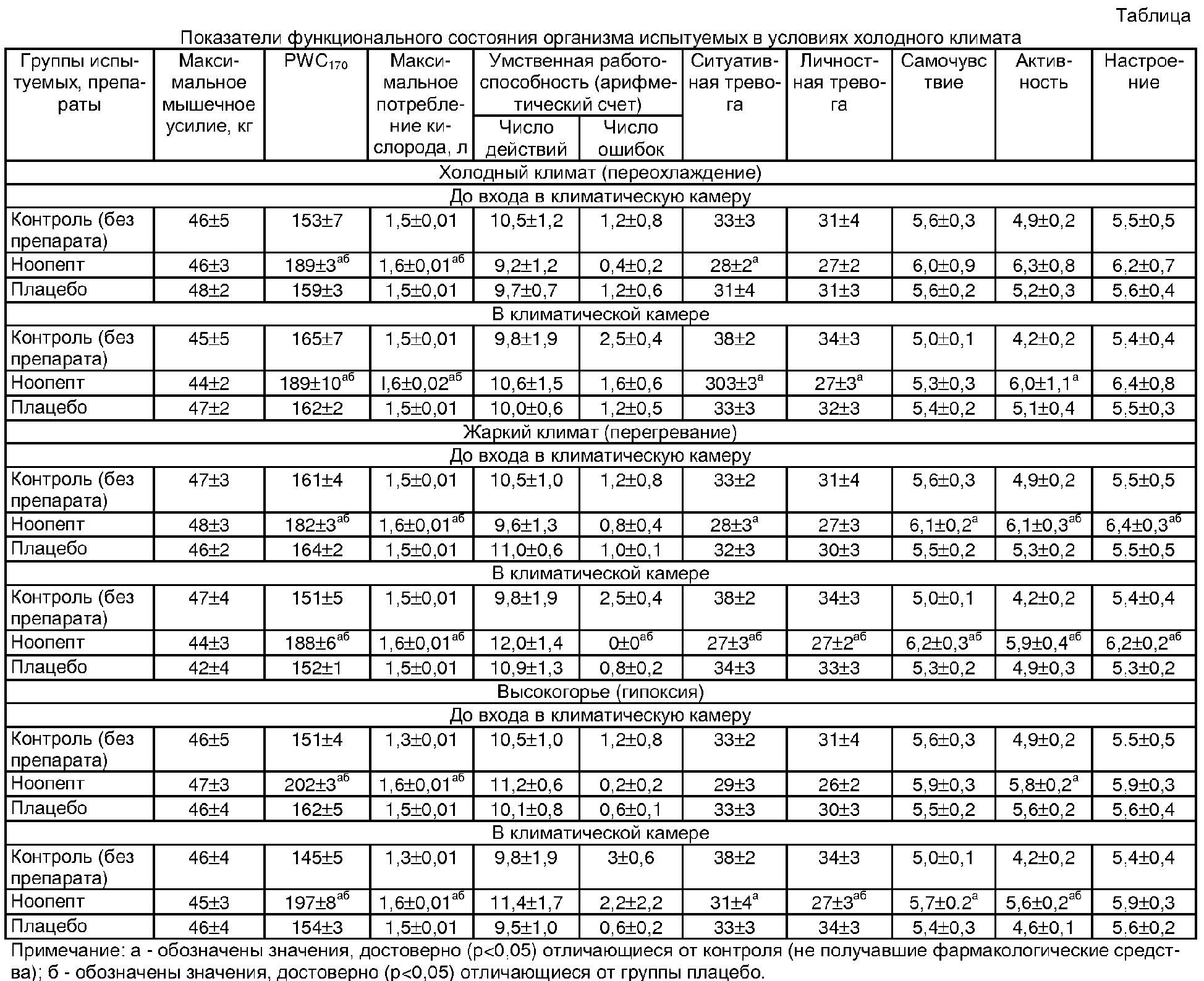 (56) (продолжение): Изобретение относится к области медицины, в частности к области фармакологии, и может быть использовано для повышения метеоустойчивости у человека в изменяющихся климатических условиях. Известны вещества, использующиеся для ускорения адаптации к изменяющимся условиям среды (адаптогены). К ним относятся препараты растительного и животного происхождения (экстракт и настойка женьшеня, элеутерококка, заманихи, лимонника, пантакрин, сайтарин). Недостатком их применения является малая эффективность при однократном применении. Как правило, их действие проявляется только при курсовом введении (прием в течение не менее 2-3 недель). У лимонника ярко выражено токсическое действие на миокард (повышение кислородного запроса) [Брехман И.И. Элеутерококк. Л.: Наука, 1968. 168 с.]. Систематического изучения всех этих препаратов с точки зрения повышения метеоустойчивости организма к повреждающим факторам внешней среды не проводилось или проводилось ограниченно в основном для спецконтингентов. Однако массовый характер миграции больших популяций людей (перелет миллионов туристов на отдых в осенне-зимний период в страны Африки, Юго-Восточной Азии из стран северной Европы, европейской части России, Сибири и обратно), вынужденная переаклиматизация их в связи с перемещениями, возникающие при этом заболевания (ОРВИ, обострение хронических заболеваний, специфические инфекции) – все это требует разработки и изучения новых метеоадаптогенов для специального (экстремальная и военная медицина) и массового применения. Цель изобретения – повышение метеоустойчивости у человека в изменяющихся климатических условиях при однократном применении ноопепта. Цель достигается применением ноопепта. Приводим пример реализации предлагаемого решения. Нооопепт вводят непосредственно за 40 минут перед началом исследования иптраназально 0,1 мг в 0,9%-ном растворе хлорида натрия (применяемая доза составляет 1/100 от разовой дозы препарата). Для доказательства возможности промышленной применимости заявляемого решения были исследованы метеоадаптогенные свойства ноопепта. Исследования осуществлялись в климатической термобарокамере «Табай» (Япония) на здоровых добровольцах, мужчинах 20-22 лет, в 3 этапа, на протяжении 3 дней. Первый этап – оценка работоспособности в условиях холодного климата (температура внешней среды – -10°С, скорость движения воздуха – 2,5 м/с). Второй этап – оценка работоспособности в условиях жаркого климата (температура внешней среды – +45°С, относительная влажность – 80%). Третий этап – оценка работоспособности в условиях высокогорья (высота над уровнем моря 3000 м, температура внешней среды – +18°С). У испытуемых, находящихся в состоянии покоя, регистрировали физиологические показатели: систолическое и диастолическое артериальное давление, частоту сердечных сокращений, частоту дыхания, минутный объем дыхания, максимальное мышечное усилие (кистевая динамометрия, кг) левой и правой рукой. После этого проводили функциональные пробы: статическую и динамическую треморометрию (оценка тонких координированных движений), статоэргометрическую нагрузочную пробу PWC170. Этот показатель физической работоспособности оценивают с помощью велоэргометра; он показывает, при какой мощности физической нагрузки частота сердечных сокращений до