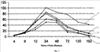 Динамика изменения содержания меди в крови исследованных животных приведена на Фиг.1. На оси абсцисс указано время отбора образцов, по оси ординат – содержание меди в крови мышей, мкг/г. Кривые 1, 2 и 3 показывают зависимость содержания меди в крови мышей от времени при введении Препарата 1, 2 и 3 соответственно, кривая 4 показывает зависимость содержания меди в крови мышей от времени при введении Трилона Б, а кривая 5 – то же для контрольной группы. Показано, что в первые 12-24 часа исследования концентрация меди в крови нарастает, после чего происходит ее снижение. Обнаружено, что в опытных группах содержание меди в крови падает значительно быстрее, чем в контрольной группе. Препараты 1 и 2 (с молибденовокислым аммонием) были несколько менее эффективны, чем Препарат 3 (не содержащий молибденовокислого аммония).