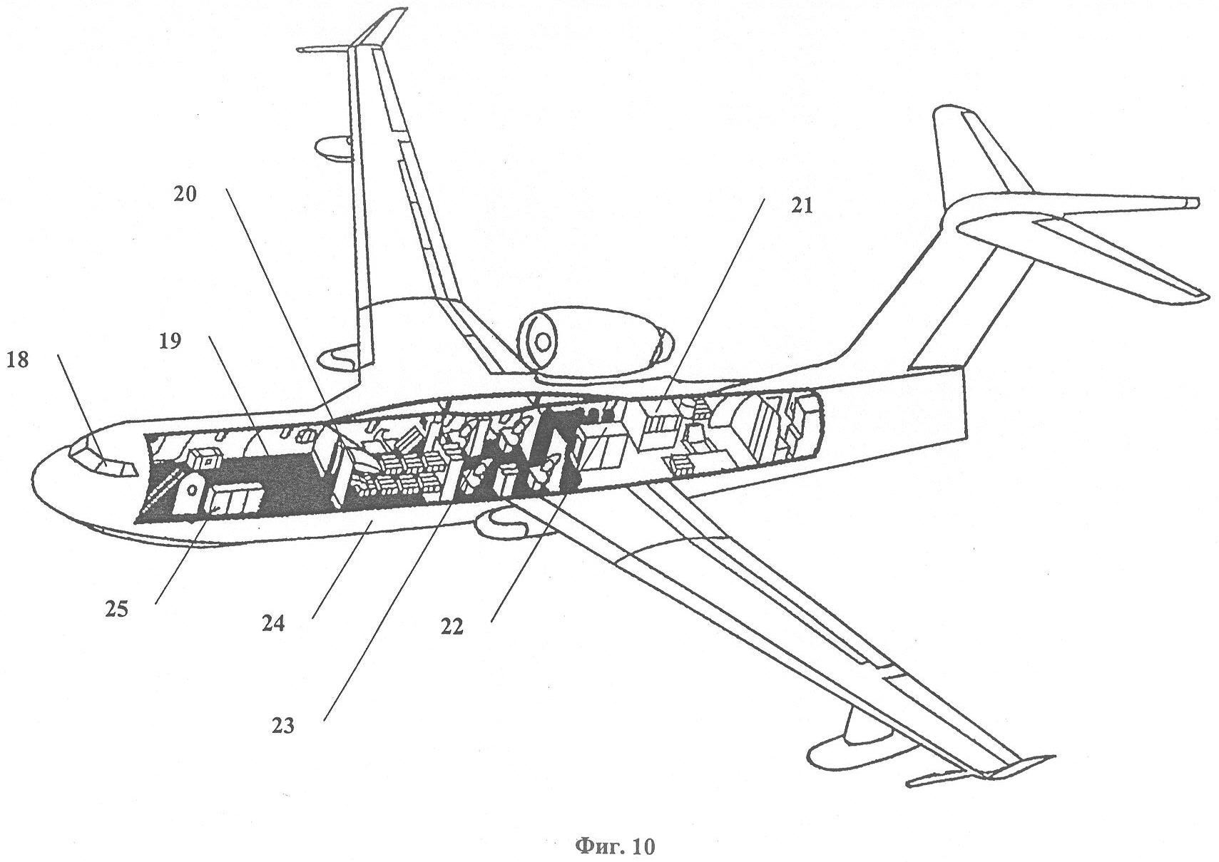 Многофункциональный самолет-амфибия типа Бе-200 (фиг.10) используется в качестве транспортного средства со средствами для ликвидации последствий чрезвычайной ситуации. В кабине 18 находятся пилоты и штурман. Грузовой отсек 19 предназначен для размещения полезной нагрузки, в том числе веществ, материалов и оборудования для ликвидации последствий чрезвычайной ситуации. Отсек 20 служит для отдыха экипажа и/или для оказания помощи пострадавшим. Шлюзовая камера 21 используется для спуска на воду плавающих средств и принятия на борт с поверхности водоемов пострадавших. В отсеке 22 установлено бортовое радиоэлектронное оборудование и средства управления применением средств ликвидации последствий чрезвычайной ситуации. Отсек 23 предназначен для операторов радиоэлектронного оборудования и средств ликвидации последствий чрезвычайной ситуации. Отсеки 22 и 23 могут быть использованы для размещения в них станции мониторинга и управления полетом беспилотного летательного аппарата. В грузовом отсеке 24 находится вода для тушения пожаров. Плавающее средство 25, выполненное в виде лодки или плота, установлено в грузовом отсеке 19.