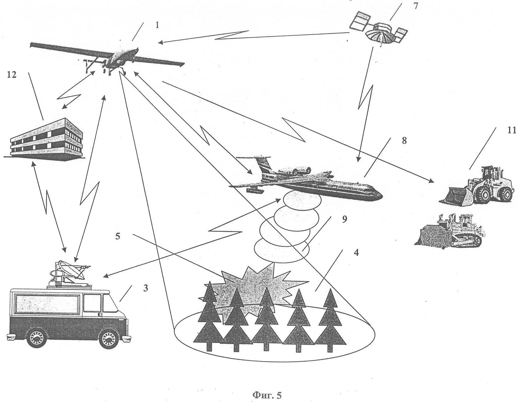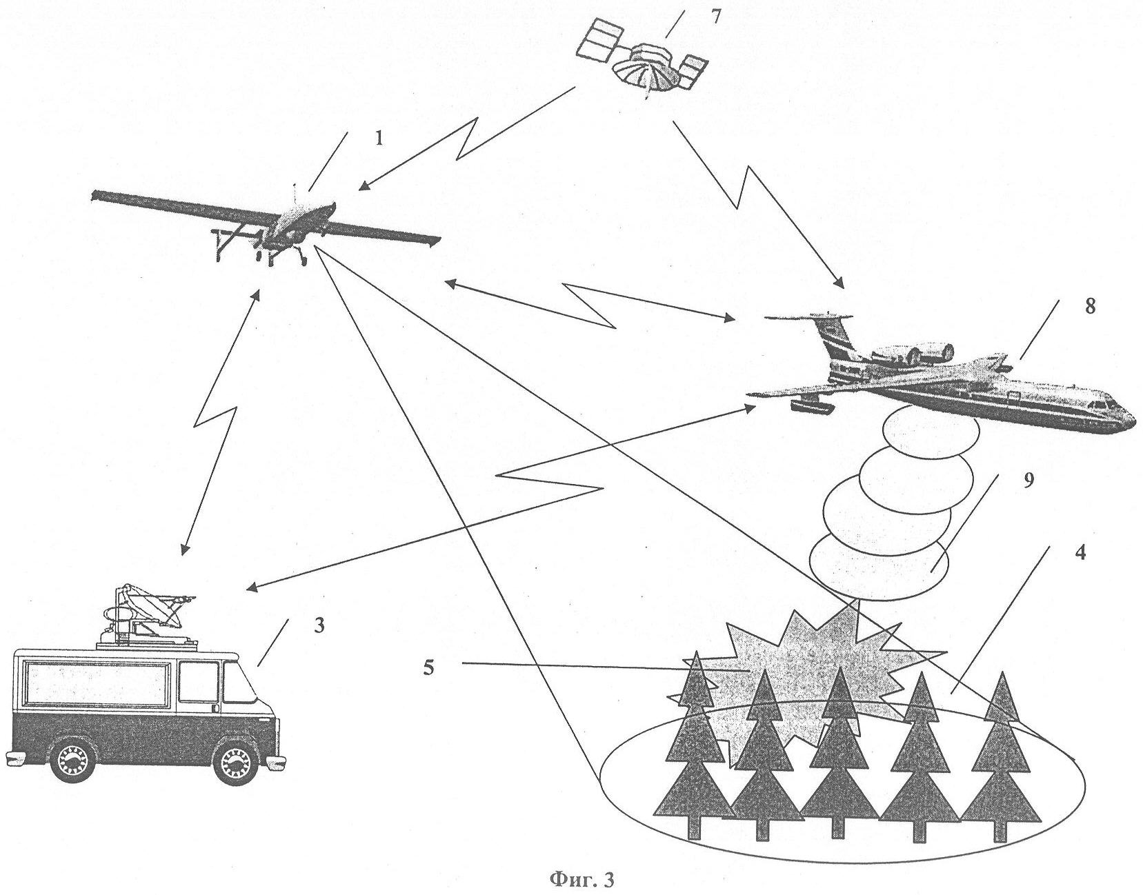 С самолета-амфибии 8 сбрасывают (фиг.3) средства 9 для тушения пожара. В качестве средств 9 используется вода или другое подавляющее огонь вещество. Результаты наблюдения обстановки в районе пожара 5, данные о координатах, высоте и скорости полета летательного аппарата 1 передаются экипажу самолета-амфибии 8 в реальном масштабе времени непосредственно с борта летательного аппарата 1 и/или через станцию 3. С помощью данных, получаемых от бортовых средств наблюдения беспилотного летательного аппарата 1, экипаж самолета-амфибии 8 может оценить результаты тушения пожара 5 за счет применения средства 9.