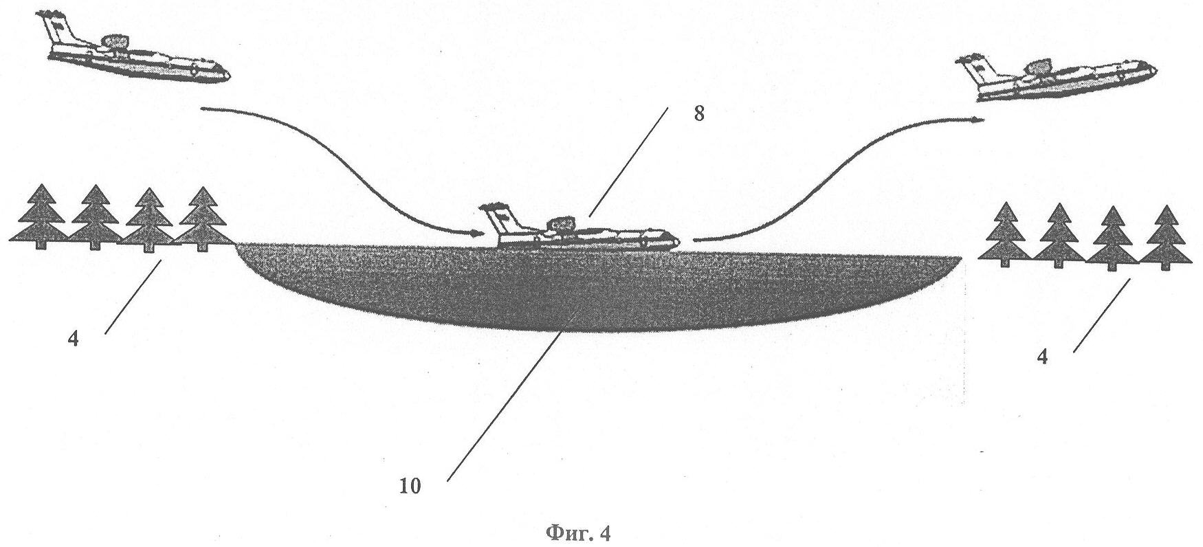 Посадка (фиг.4) самолета-амфибии 8 на поверхность водоема 10, расположенного в лесном массиве 4, осуществляется с целью: