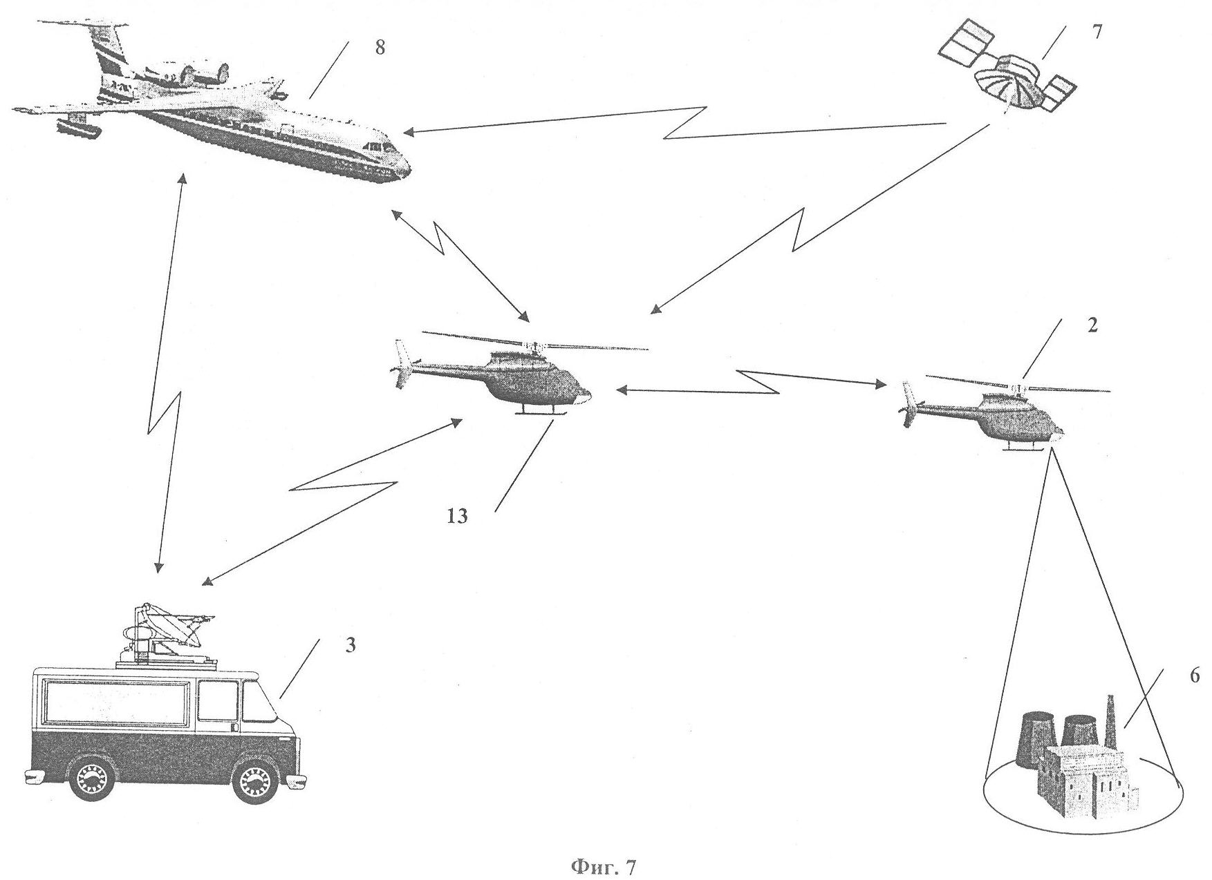 Направление в район чрезвычайной ситуации самолета-амфибии 8 со средствами ликвидация последствий техногенной катастрофы на удаленном промышленном объекте 6 осуществляется с использованием ретранслятора, размещенного на воздушной платформе 13 (фиг.7). Координаты района 6 чрезвычайной ситуации, данные о координатах, высоте и скорости полета беспилотного летательного аппарата 2 и воздушной платформы 13, а также результаты наблюдения обстановки в районе 6 передаются экипажу самолета-амфибии 8 в реальном масштабе времени через ретранслятор на воздушной платформе 13 и/или со станции 3. Указанные координаты определяются с помощью спутниковой системы радионавигации 7.