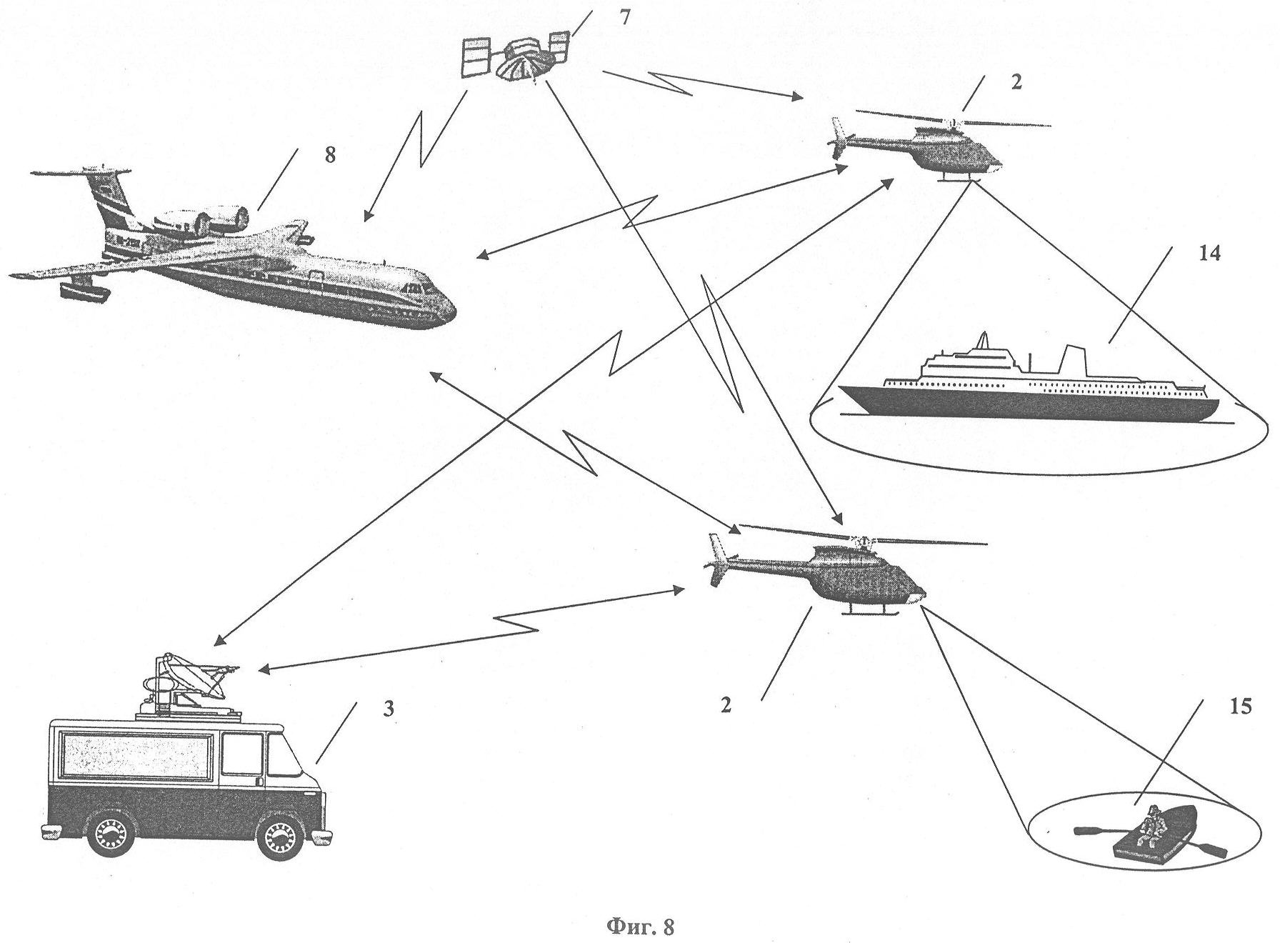 При спасательной операции на море (фиг.8) беспилотный летательный аппарат 2 обеспечивает мониторинг обстановки на терпящем бедствие судне 14. С помощью другого беспилотного летательного аппарата 2 проводится поиск пострадавших людей 15. В район чрезвычайной ситуации направляется самолет-амфибия 8 со средствами для ликвидации чрезвычайной ситуации. Координаты терпящего бедствие судна 14 и пострадавших людей 15, данные о координатах, высоте и скорости полета беспилотных летательных аппаратов 2, а также результаты наблюдения обстановки в районе чрезвычайной ситуации передаются экипажу самолета-амфибии 8 в реальном масштабе времени непосредственно с беспилотных летательных аппаратов 2 и/или через станцию 3. Указанные координаты определяются с помощью спутниковой системы радионавигации 7. Применение в качестве транспортного средства со средствами для ликвидации чрезвычайной ситуации многофункционального самолета-амфибии типа Бе-200 позволяет потушить пожар на судне, доставить необходимое оборудование и материалы для ремонта, а также эвакуировать пострадавших и нуждающихся в медицинской помощи людей.