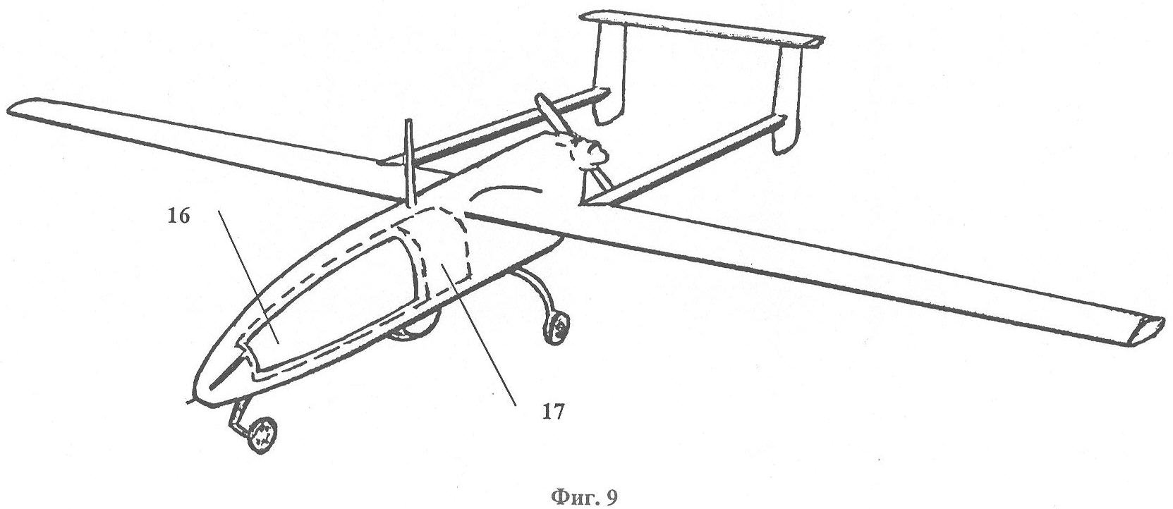 В отсеке 16 беспилотного летательного аппарата (фиг.9) установлено все бортовое радиоэлектронное оборудование и датчики радиационного и химического контроля воздушной среды. В грузовом отсеке 17 располагаются малогабаритные грузы и предметы первой необходимости (в том числе средства связи, медикаменты, продукты питания), а также электромеханическое устройство их сброса в районе чрезвычайной ситуации, том числе с помощью парашюта, по команде со станции управления полетом.
