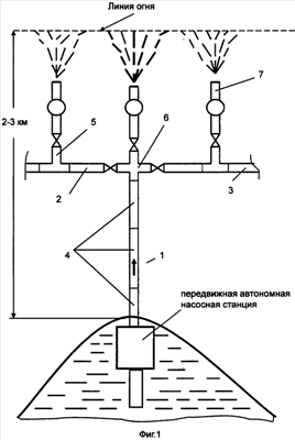 1. Способ тушения лесных ландшафтных пожаров, заключающийся в том, что к очагу возгорания доставляют пожарную технику, осуществляют монтаж разветвленной быстросборной трубопроводной системы, после чего подают воду в очаг возгорания, при этом в процессе тушения пожара выполняют наращивание ветвей трубопроводной системы как во фронтальном, так и в радиальном направлениях, после тушения пожара на полосе глубиной 40-50 м и шириной 300-400 м продолжают подачу воды в очаг возгорания и одновременно осуществляют дополнительное наращивание ветвей трубопроводной системы в радиальном и фронтальном направлениях, выполняя при этом демонтаж труб на первоначально собранных ветвях, не используемых для тушения пожара, и передачу их на новые участки пожаротушения, прекращают подачу воды после полного тушения пожара.