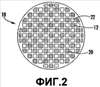 Со ссылкой на фиг.2 показан вид, изображающий впускной конец дизельного фильтра с торца. Как видно на фиг.2, впускные концы 22 впускных каналов окружены стенками каналов 12. Стенками каналов также окружены заменяемые заглушки 20 для впускных концов выхлопных каналов. Как можно видеть на фиг.2, непосредственно примыкающие друг к другу впускные и выхлопные каналы размещены попеременно вдоль рядов, а также вдоль столбцов.