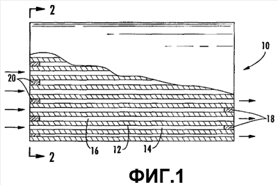 Стенка 12 содержит керамику игольчатой структуры, такую как муллит игольчатой структуры. Важным является средний размер пор и распределение пор по размерам в пористой среде. Если размер пор слишком большой, то через стенку 12 будет проходить слишком много твердых частиц, содержащихся в выхлопных газах, которые не будут улавливаться в ней. С другой стороны, если размер пор пористой среды слишком мал, то площадь стенки 12 (и следовательно, объем и вес фильтра 10), необходимая для поддержания допустимого противодавления, будет относительно большой. Предпочтительно пористость (то есть процент объема пористой среды, который представляет собой открытые поры) пористой среды является относительно высокой, например, выше 50 процентов, для того чтобы данная площадь стенки использовалась более эффективно. Предпочтительно средний размер пор составляет приблизительно от десяти до двадцати микрон.