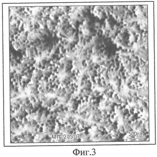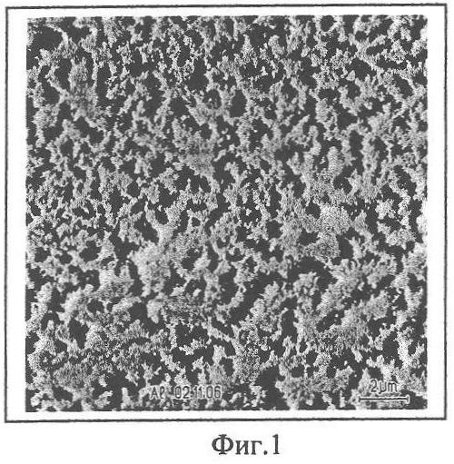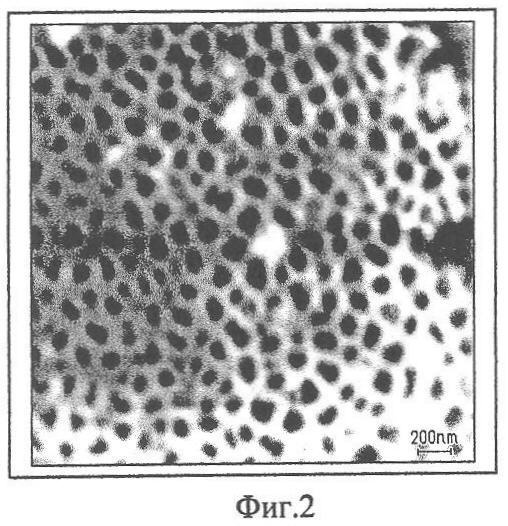 Пример 4. Алюминиевую фольгу размерами 2,5×2,5×0,07 см полировали в 20% NaOH при температуре 60°С в течение 30 сек, после чего подвергали анодному окислению в 0,3 м щавелевой кислоте (СООН)2 при комнатной температуре и напряжении (V), равном 60 В в течение 3 часов. В результате этого алюминиевая фольга становилась пористой (см. фиг.1). Вскрытие дна пор проводили при температуре 35°С смесью концентрированных фтористоводородной (HF), азотной (HNO3) и уксусной кислот (СН3СООН) при следующем соотношении компонентов (объемные проценты):