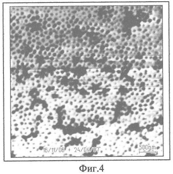 Затем проводили очистку пор в 0,1 м ортофосфорной кислоте (Н3PO4) при комнатной температуре в течение 30 мин. Изображение полученной мембраны представлено на фиг.4.