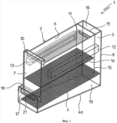 Еще одной отличительной особенностью изобретения является коническая форма распределительной камеры 19, которая постепенно сужается от задней стенки 8 контейнера 2 к передней панели 17. Такая геометрия распределительной камеры обеспечивается определенным наклоном нижнего листа 4а основания к его верхнему листу 4 с постепенным уменьшением расстояния между листами основания в направлении передней панели 17.