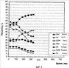 Как проиллюстрировано на Фиг.2, материал обычно подвергают ступенчатому этапному повышению температуры, которое предусматривает как само повышение температуры, так и выдерживание при этой температуре. Повышение температуры используют для достижения температурного профиля, который дополняет полимерное связующее вещество. Как известно специалистам в данной области, обычные температурные показатели для сгорания могут повышаться по мере увеличения времени и температуры. Например, при раннем повышении от окружающей температуры температурный показатель может быть около 200°С примерно за 1/4 часа с последующим периодом выдержки в течение 1/4 часа. Усредненные по периодам возрастания и выдерживания скорости находятся в диапазоне примерно от 75°С до примерно 200°С в течение примерно 1/2 часа, или примерно 200°С (180-220°С) – примерно 400°С в час. При конечных температурах прокаливания, где температуры выше и деструкция снижается, используют также более высокие температурные показатели. Подобным же образом, удовлетворительные режимы включают в себя также, большей частью, постоянные температурные режимы примерно 400°С в час.