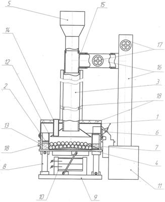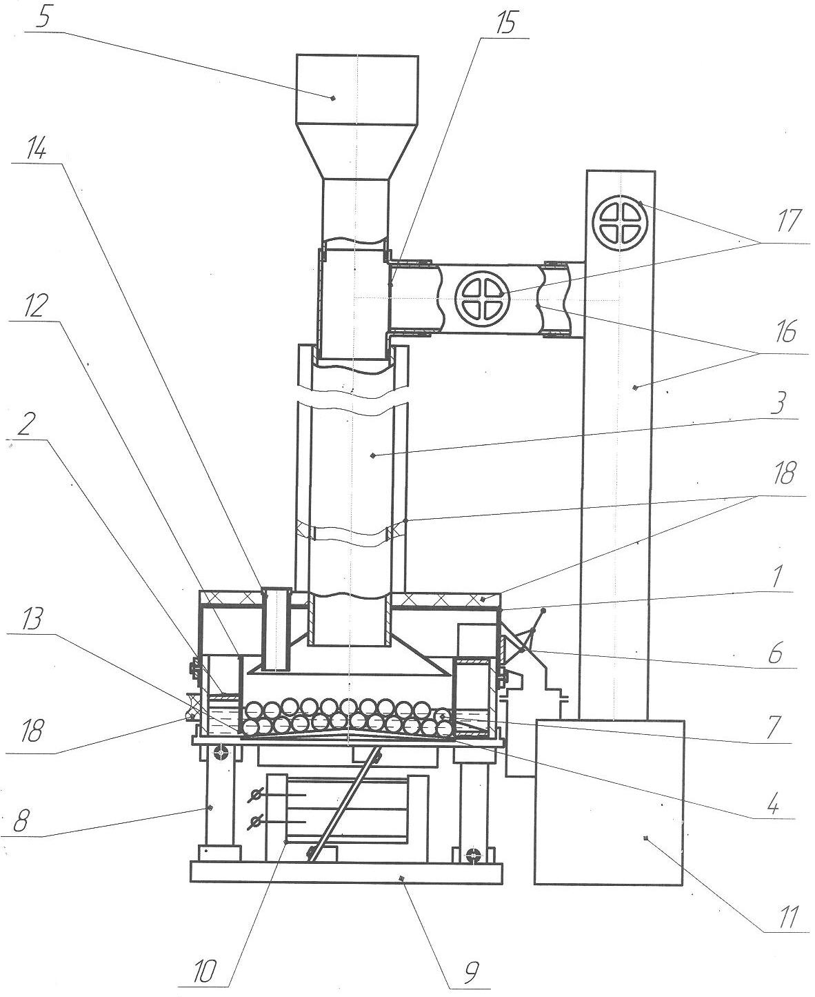 В цилиндрической рабочей камере 1 установлен внутренний сплошной цилиндр 12 таким образом, что между ним и конически-выпуклым днищем остается регулируемый зазор 13, определяющий размер получаемой фракции продукта. Мелющие тела 7 расположены во внутренней части цилиндра 12. В крышке рабочей камеры 1 расположены штуцер 14 для подачи хладагента, что позволяет значительно увеличить разновидность перерабатываемых материалов, и дефлектор 3, выполненный в виде вертикальной трубы с расположенными в нижней ее части коническим зонтом и в верхней – загрузочной воронкой 5. В дефлекторе 3 осуществляется предварительное замораживание сырья в среде испарившегося хладагента, что способствует снижению его расхода. Причем дефлектор 3 расположен по центру крышки и соединен с вентилятором 11 посредством системы парового коллектора 16 с заслонками 17, обеспечивающими направленное движение газовой смеси. Коллектор на входе снабжен фильтрующей перегородкой 15 для предотвращения попадания в него частиц сырья. Наружные поверхности цилиндрической рабочей камеры 1 и дефлектора 3 покрыты теплоизолирующим материалом 18.
