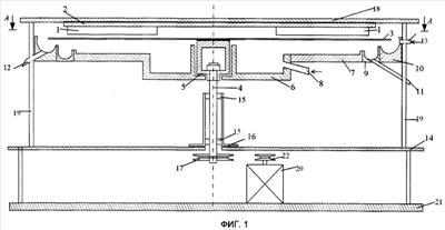 Магнитный центробежный сепаратор состоит из магнитной системы с неподвижными постоянными магнитами 1, расположенными по радиусам окружности магнитопровода 2 с чередованием полярностей, транспортирующего органа 3, выполненного в виде диска из немагнитного материала, установленного на валу 4 с помощью насадки 5, питателя 6 цилиндрической формы с пульпораспределительным кольцом 7 и подводящим патрубком 8, приемников продуктов разделения, выполненных в виде концентрических желобов для немагнитной фракции 9 и магнитной фракции 10 со сливными патрубками 11, 12 и водоподводящим патрубком 13. Вал 4 закреплен на опорной плите 14 при помощи подшипников 15 и подставки 16, и снабжен шкивом 17. Магнитопровод 2 расположен на держателе 18, установленном на стойках 19. Электродвигатель 20 размещен на станине 21 и снабжен шкивом 22.