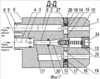 Регулировка усилия пружины 13 золотника 11 осуществляется вращением винта 24 (фиг.1, 4, 5, 7) по резьбе 25 (фиг.1, 4, 5, 7). Регулировка усилия пружины 17 ползуна 14 осуществляется вращением винта 26 (фиг.2, 4, 6, 7) по резьбе 27 (фиг.2, 4, 6, 7). Регулировка усилия пружины 22, поджимающей тело 23, осуществляется вращением винта 28 (фиг.1, 3, 5, 8) по резьбе 29 (фиг.1, 3, 5). Прокладка 30 (фиг.1, 4, 5, 7) установлена в сквозном отверстии 2 круглого корпуса 1 и уплотняет золотник 11. Перекрытие продольных каналов 7 осуществляется подпружиненным телом 23, которое упирается в опорную поверхность 31 (фиг.1, 3, 5).