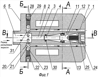 Устройство работает следующим образом. Распыляемую жидкость подают через отверстие 6 подвода жидкости в сквозное отверстие 2 круглого корпуса 1. При достижении определенного давления жидкости в сквозном отверстии 2 жидкость из сквозного отверстия 2 направляется в радиальные отверстия 20, отжимая от опорной поверхности 31 тело 23, которое сжимает пружину 22, упирающуюся в винт 28 (фиг.1, 3). Винт 28 имеет возможность перемещаться по резьбе 29 вдоль оси 21 радиального отверстия 20, создавая необходимое усилие на пружине 22. Из радиального отверстия 20 жидкость направляется в продольные каналы 7 для подачи жидкости и по этим каналам подается в факел распыления. Жидкость, находящаяся в сквозном отверстии 2, также оказывает давление на золотник 11, который сжимает пружину 13, упирающуюся в винт 24. Винт 24 имеет возможность перемещаться по резьбе 25 вдоль оси 3 сквозного отверстия 2, создавая необходимое усилие на пружине 13. Смещение золотника 11 вдоль оси 3 сквозного отверстия 2 приводит к тому, что каждый ползун 14, взаимодействующий торцом 15 с конической поверхностью 12 золотника 11, под действием пружины 17, взаимодействующей с торцом 16 ползуна 14, перемещается вдоль оси 19 отверстия 18. Пружина 17 взаимодействует с винтом 26. Винт 26 имеет возможность перемещаться по резьбе 27 вдоль оси 19 отверстия 18, создавая необходимое усилие на пружине 17. Под действием пружины 17 ползуны 14 перемещаются по конической поверхности 12 золотника 11, перемещающегося под действием давления жидкости, находящейся в сквозной полости 2, к оси 3 сквозного отверстия 2. При этом происходит открытие продольных каналов 10 для подачи рабочего газа (фиг.2,4). Таким образом, при увеличении давления жидкости в сквозном отверстии 2 происходит открытие продольных каналов 7 для подачи жидкости и продольных каналов 10 для подачи рабочего газа (фиг.1-4). При уменьшении давления жидкости в сквозном отверстии 2 тело 23 перекрывает подачу жидкости в продольные каналы 7 для подачи жидкости, прижимаясь к опорной поверхности 31 (фиг.5). Пружина 13 перемещает золотник 11, при этом ползуны 14, взаимодействующие торцом 15 с конической поверхностью 12 золотника 11, сжимают пружины 17 и перекрывают продольные каналы 10 для подачи рабочего газа (фиг.6, 7). Таким образом, при уменьшении давления жидкости в сквозном отверстии 2 происходит закрытие продольных каналов 7 для подачи жидкости и продольных каналов 10 для подачи рабочего газа (фиг.5-7). Согласование расходов жидкости и рабочего газа осуществляют настройкой пружины 13, вращая винт 24 по резьбе 25, пружин 22, вращая винты 28 по резьбе 29, пружин 17, вращая винты 26 по резьбе 27. Таким образом, изменение площади проходного сечения продольных каналов 7 для подачи жидкости и продольных каналов 10 для подачи рабочего газа в зависимости от давления жидкости в сквозном отверстии 2 позволяет поддерживать определенное соотношение расходов жидкости и рабочего газа, что приводит к получению капель одинаковой дисперсности.