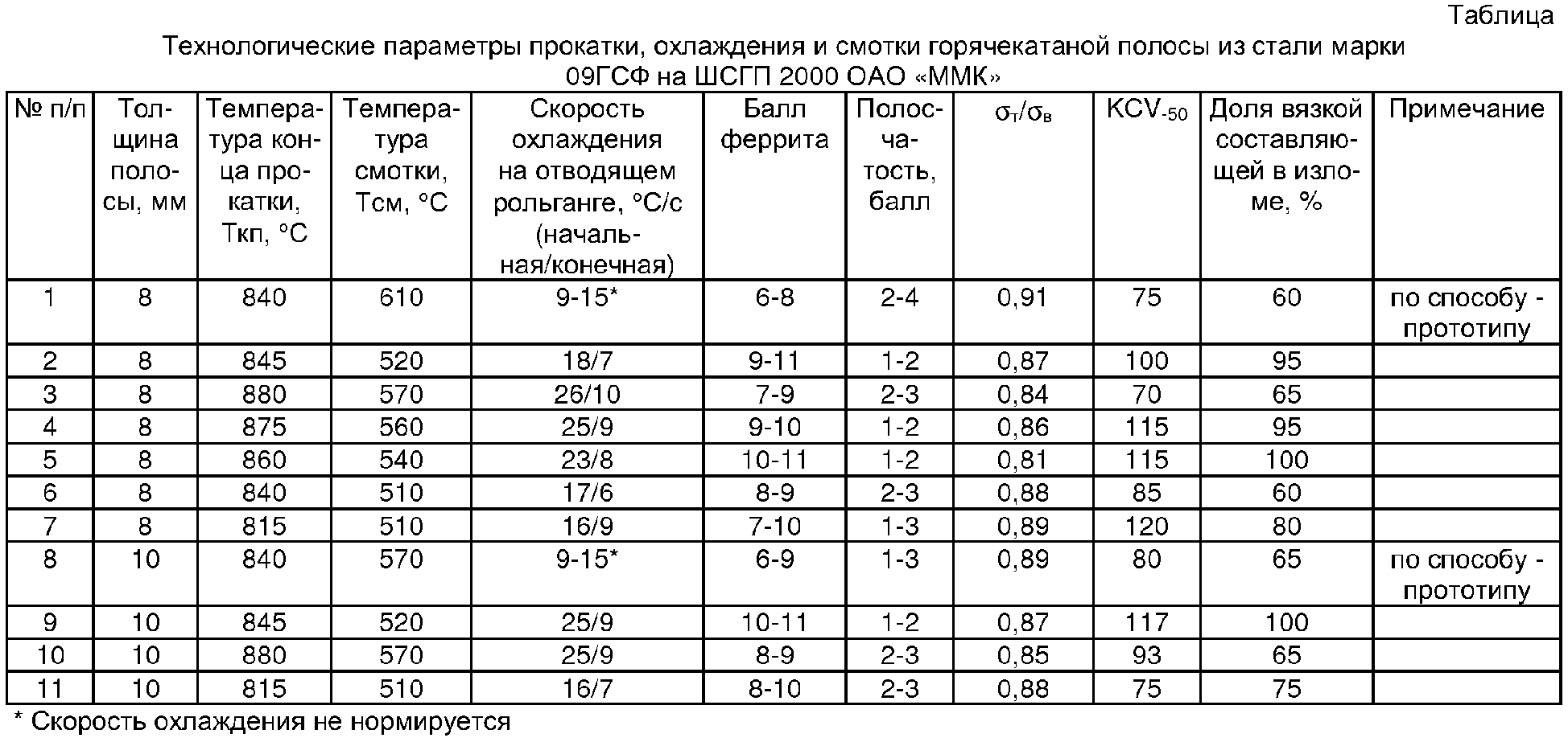 ) в чистовой группе стана не менее 82% обеспечить температуру конца прокатки полосы в последнем чистовом проходе группы в диапазоне 845÷875°С. После этого прокат по отводящему рольгангу направляется к моталкам второй группы. На отводящем рольганге осуществляют дифференцированное охлаждение поверхности полосы водой сверху и снизу секциями душирующего устройства. При этом осуществляют управляемое переменное охлаждение полосы водой. Причем, при выбранном температурно-скоростном режиме прокатки, в первые три секунды после окончания горячей прокатки охлаждение производят со скоростью 18÷25 °С/с путем управляемого включения первых охлаждающих секций. После чего скорость охлаждения устанавливают 7÷9°С/с путем управляемого охлаждения поверхности полосы душирующими устройствами (схемой их включения). Это обеспечивает температуру смотки полосы в диапазоне 520÷560°С и, кроме того, выравнивает температуру рулона, что способствует формированию заданного уровня физико-механических свойств.