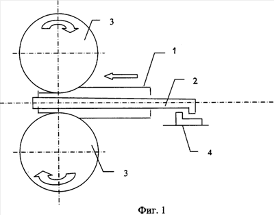 Согласно предлагаемому способу деформации на начальной стадии процесса раскатки, как показано на фиг.1, гильзу 1 с вставленной в нее оправкой 2 захватывают валками 3 и перемещают в направлении прокатки, обжимая по диаметру и толщине стенки. При этом стопор 4 не препятствует перемещению оправки, и оправка свободно перемещается через очаг деформации в соответствии с энергетическим балансом процесса. Через некоторый промежуток времени передний конец оправки 2 выходит за границы очага деформации, а задний стопорится, например с помощью стопора 4 (фиг.2). После этого перемещение оправки в продольном направлении прекращается, и гильза 1 при деформации валками 3, перемещаясь в продольном направлении, сползает с оправки. Длина заднего, недеформированного конца гильзы 1 при этом укорачивается и в некоторый момент времени становится равной величине, большей на 1,2 м длины оправки, деленной на коэффициент вытяжки гильзы при ее раскатке в черновую трубу. После этого длины оправки 2 будет достаточно, чтобы осуществить деформацию оставшегося конца гильзы 1 при свободном (плавающем) перемещении оправки 2. Поэтому в данный момент стопор 4 освобождает оправку 2 (фиг.3), и процесс заканчивается на плавающей оправке. При этом освобождается приемная сторона раскатного стана, и на нее можно устанавливать и готовить к деформации следующую гильзу. Благодаря этому до минимума сокращается время между раскаткой гильз, обеспечивается высокая производительность раскатного стана, и увеличивается срок службы оправок.