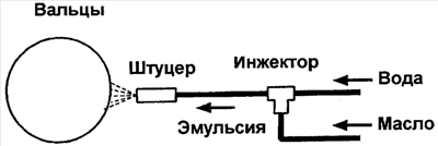 В наиболее практическом выполнении вода, подаваемая в инжектор, имеет температуру между 0°С и 25°С, смазочные материалы смешивают с этой водой и смесь инжектируется штуцером подачи смазки, температуру смеси регулируют (вышеупомянутый способ смешивания (ii)). В этом выполнении можно регулировать температуру воды, чтобы она была не ниже 0°С, но не выше 25°С, смешивать воду со смазочными материалами и инжектировать, и подавать смазочную эмульсию штуцером подачи смазки на валки прокатного стана. Объемные пропорции смазочных материалов составляют от 0,5 до 5 частей на 100 частей воды, и предпочтительно, от 0,5 до 2 частей смазочных материалов на 100 частей воды. В этом случае температура самих смазочных материалов уменьшается в трубе от инжектора до штуцера, но отношение смеси смазочных материалов в эмульсии очень низкое. Поэтому, даже когда температура смазочных материалов в этой зоне снижается, проблемы, например, засорения трубопровода, менее вероятны.