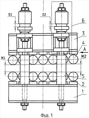Для установки между роликами 2 и 4 клинового зазора пара штоков 7 цилиндров, установленных в одной плоскости, перпендикулярной продольной оси секции, совершают ход Е1, а вторая пара штоков 7 цилиндров совершает ход Е2, величина которого отлична от хода первой пары штоков 7, при этом элементы узлов секции совершают перемещения аналогично тому, как описано выше. При установке клинового зазора между роликами 2 и 4 приводная рама 3 размещается под углом к стационарной раме 1, а ролики 2 и 4 с одной стороны секции устанавливаются с зазором Ж1, а с другой стороны секции – с зазором Ж2. При этом имеет место перекатывание цилиндрических поверхностей упоров 9 по плоским поверхностям торцов стаканов 8, находящихся в постоянном контакте, за счет поджатия со стороны тарельчатых пружин 10, и смещение пятен контактов опорных поверхностей стаканов 8 и упоров 9 друг относительно друга на угол, соответствующий углу перекоса приводной рамы 3, без изменения при этом положения штоков 7 относительно корпусов 6, в которых они расположены. При этом исключаются относительные перекосы штоков 7 и корпусов 6.