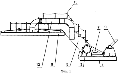 Устройство для нагрева футеровки металлургических ковшей работает следующим образом. Перед проведением очередной операции нагрева и сушки ковша (не показан) крышка 6 поднимается в вертикальное положение путем прикладывания момента вращения гидроцилиндрами 8 и 9 через поворотный рычаг 7 к несущей балке 5, на которой закреплена крышка 6. При этом крышка 6 поворачивается, как на оси, вместе с несущим поворотным коллектором 4 в подшипниковых опорах 2 и 3. Ковш литейным краном (не показан) устанавливается точно в заданное под крышкой 6 место. Потом крышка 6 с помощью гидроцилиндров 8 и 9 возвращается вместе с несущим поворотным коллектором 4 и опускается в горизонтальное положение, плотно накрывая ковш. Далее осуществляют подачу воздуха, газа и разжигают горелку. Воздух подают по поворотному коллектору 4 и присоединенному к нему патрубку 10 для подвода воздуха. Нагрев и сушку футеровки ковша осуществляют по заданному режиму. Продукты сгорания по патрубкам для отвода газа 11 и 12 удаляются в цеховую систему дымоудаления. При плотном прилегании крышки 6 к ковшу во внутреннем пространстве ковша происходит равномерное перемешивание воздухом продуктов сгорания, осуществляется равномерное удаление нагретого газа потоками, что, в свою очередь, обеспечивает равномерный нагрев и сушку футеровки ковша. При этом продукты сгорания не проникают из-под крышки в атмосферу цеха. После окончания очередной операции нагрева и сушки ковша цикл повторяется.