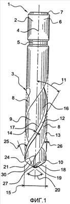 Для улучшения характеристик сверла 1, соответствующего настоящему изобретению, угол 11 наклона винтовой линии предпочтительно составляет приблизительно от 20° до 25°, рабочая часть 3 имеет угол 26 конусности, равный приблизительно 1°, каждая ленточка 12 имеет ширину 14, которая меньше около одной двадцатой части внешнего диаметра 15 рабочей части 3, каждая задняя поверхность 21 имеет угол, составляющий около 8° относительно плоскости, перпендикулярной оси 4 сверла 1, и каждая задняя поверхность 21 может быть также продолжена подрезанной поверхностью 30.